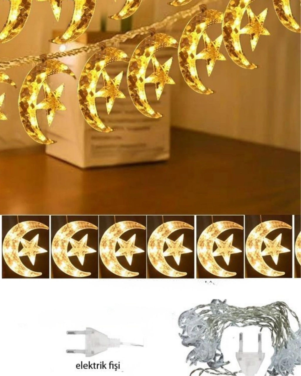 Hilal ve yıldız figürleri estetik bir bütünlük içinde tasarlanmıştır. Mekâna yerleştirildiğinde hem dekoratif hem işlevsel bir aydınlatma çözümü sunar.İki aydınlatma modu ile kullanım esnekliği sağlar. Sabit mod huzurlu bir ortam yaratırken, yanıp sönme modu daha canlı bir atmosfer oluşturur.Yüksek kaliteli malzeme yapısı ve güvenli kablo tasarımı sayesinde gönül rahatlığıyla kullanılabilir. İç mekân dekorasyonunda güçlü bir tamamlayıcı üründür.