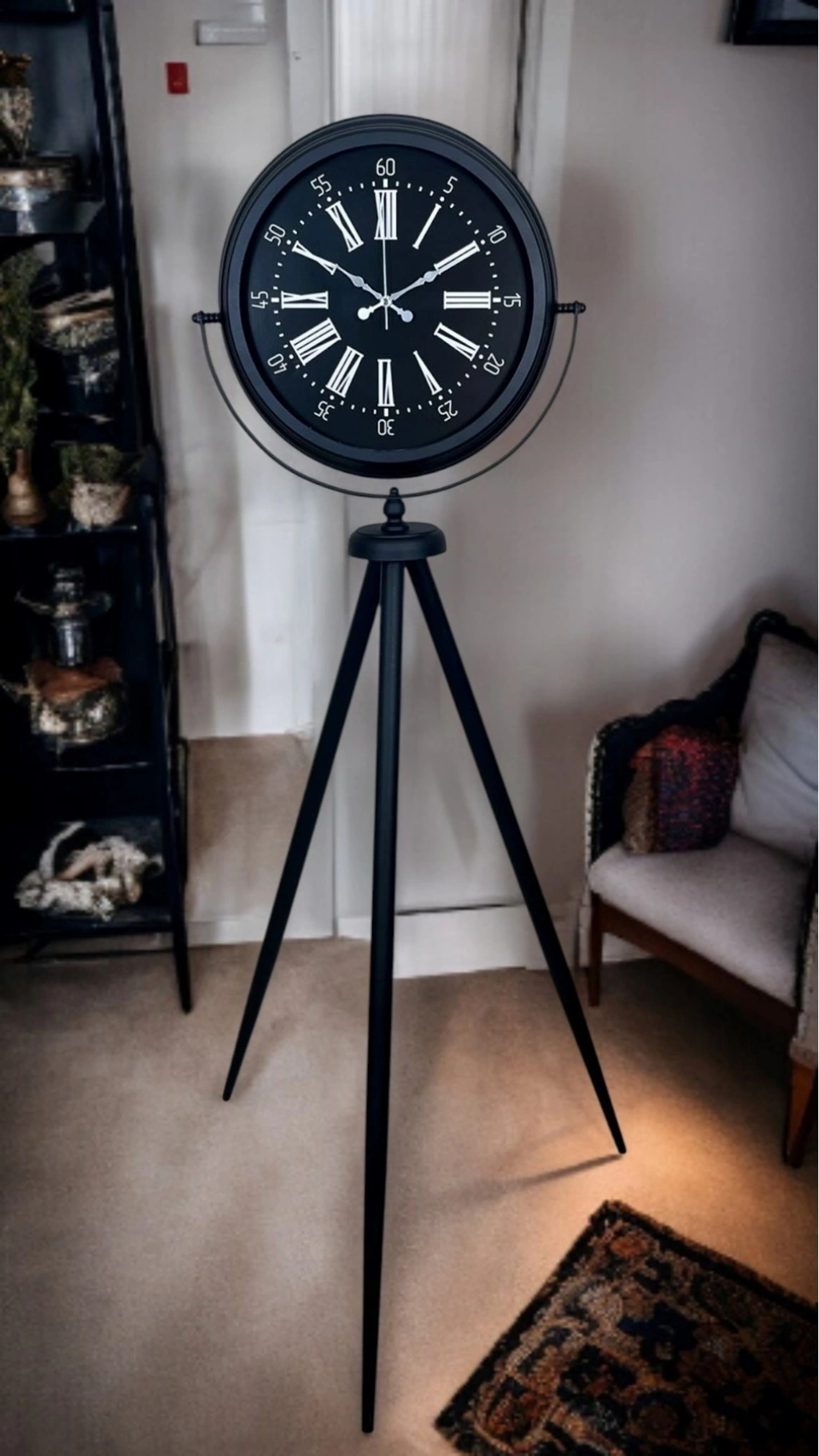 Klasik Roma rakamlarının şıklığını modern tripod tasarımla bir araya getiren Siyah Tripod Ayaklı Dekoratif Salon Saati, 150 x 45 cm ölçüsüyle bulunduğu ortamda güçlü bir duruş sergiler. Siyah metal tripod ayak yapısı; modern, loft ve endüstriyel dekorasyonlara uyum sağlarken, siyah kadran üzerindeki Roma rakamları ve çevresindeki dakika skalası ürüne hem nostaljik hem de rafine bir görünüm kazandırır. Bu özel tasarım, sıradan saatlerden farklı olarak dekorun parçası değil, çoğu zaman dekorun odak noktası olur.