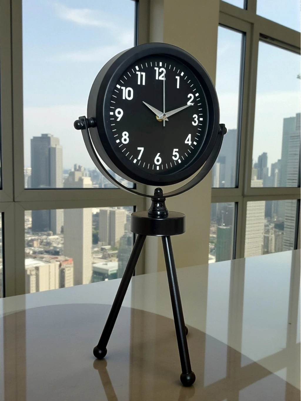 45 x 25 cm ölçülerindeki bu modern siyah üç ayaklı masa saati, minimal tasarımı ve güçlü duruşuyla her ortama şıklık katar. Gerçek cam korumalı kadranı sayesinde net görüntü ve uzun ömürlü kullanım sağlar. Tamamen metal gövdesi ve tripod ayak yapısıyla sağlam, dekoratif ve premium bir görünüm sunar. Sessiz akar saniye mekanizmasıyla ev, ofis ve çalışma alanlarında rahatsızlık vermeden kullanılabilir.