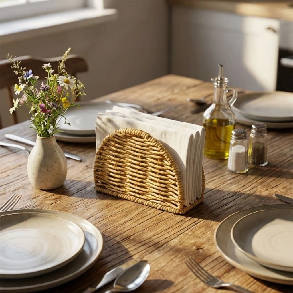 ? Dekoratif Plastik Rattan Yarım Yuvarlak Peçetelik – Doğal Hasır Dokulu Masaüstü Peçete Standı