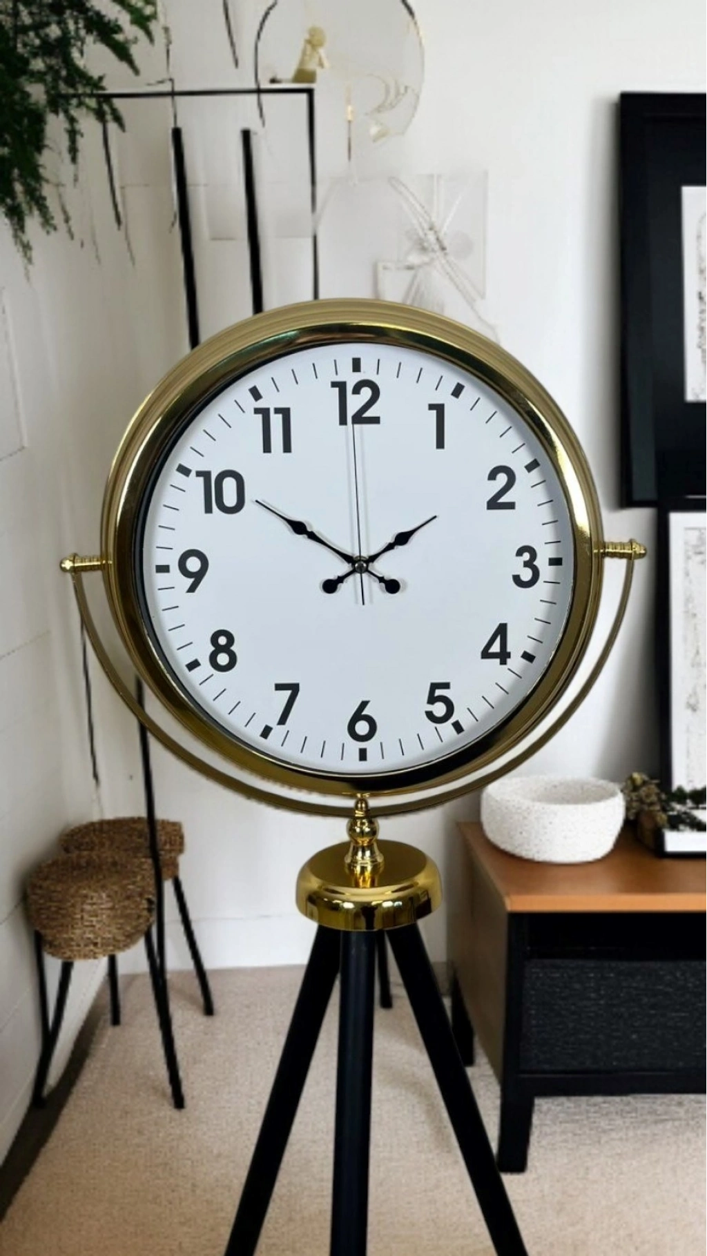 Zamana estetik bir duruş kazandıran bu gold tripod ayaklı dekoratif saat, klasik çizgileri modern detaylarla birleştirerek yaşam alanlarınıza güçlü bir karakter katar. Büyük boyutlu tasarımı sayesinde yalnızca bir saat değil, aynı zamanda mekânın odak noktası haline gelen özel bir dekor parçasıdır.