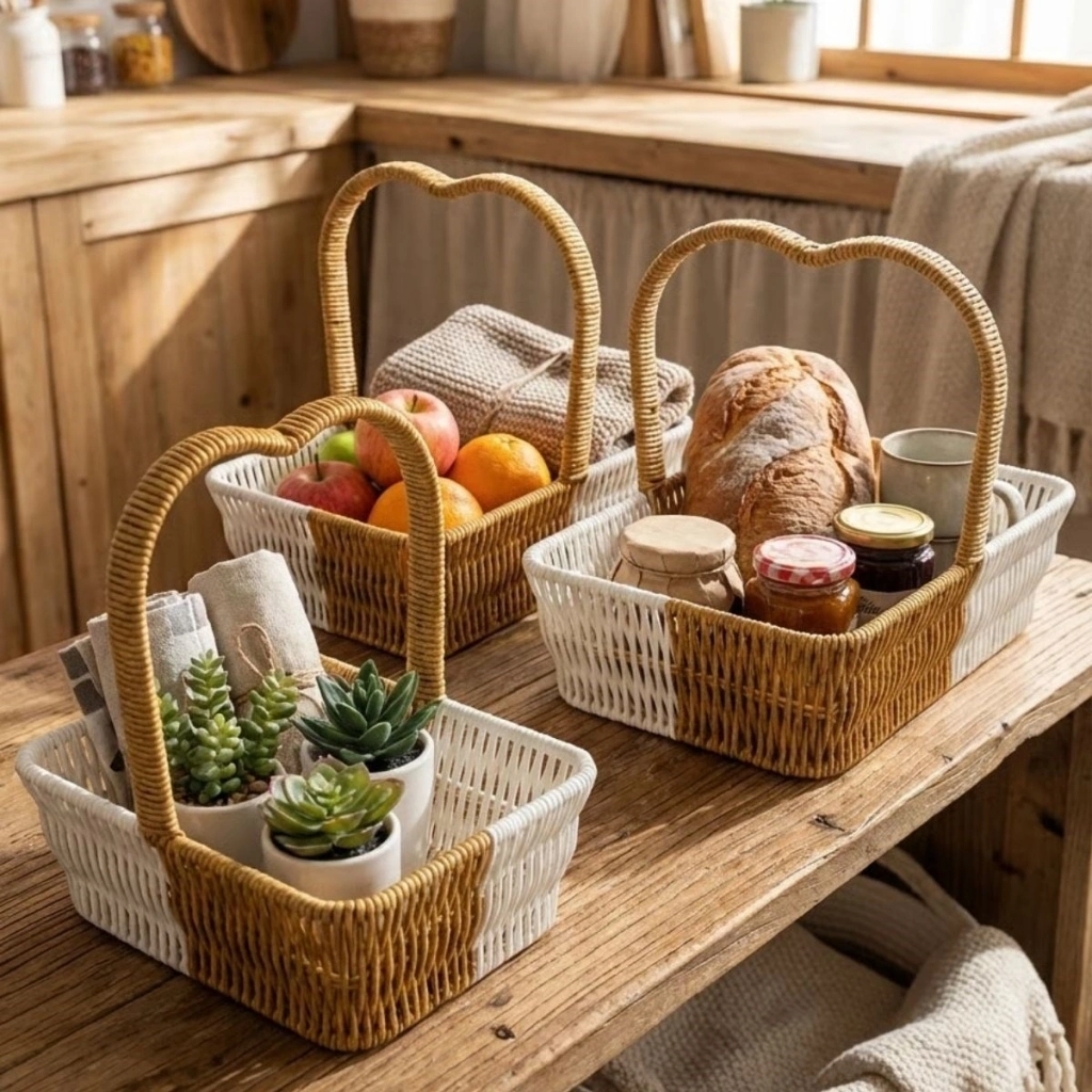 Dayanıklı plastik rattan malzemeden üretilen sepetler; hafif, sağlam ve uzun ömürlüdür. İç içe geçebilen yapısı sayesinde kullanılmadığında minimum alan kaplar. Mutfakta ekmek, meyve ve kahvaltılık sunumları; banyoda kozmetik ve kişisel bakım ürünleri; salon ve masaüstlerinde ise çok amaçlı organizer olarak rahatlıkla kullanılabilir.