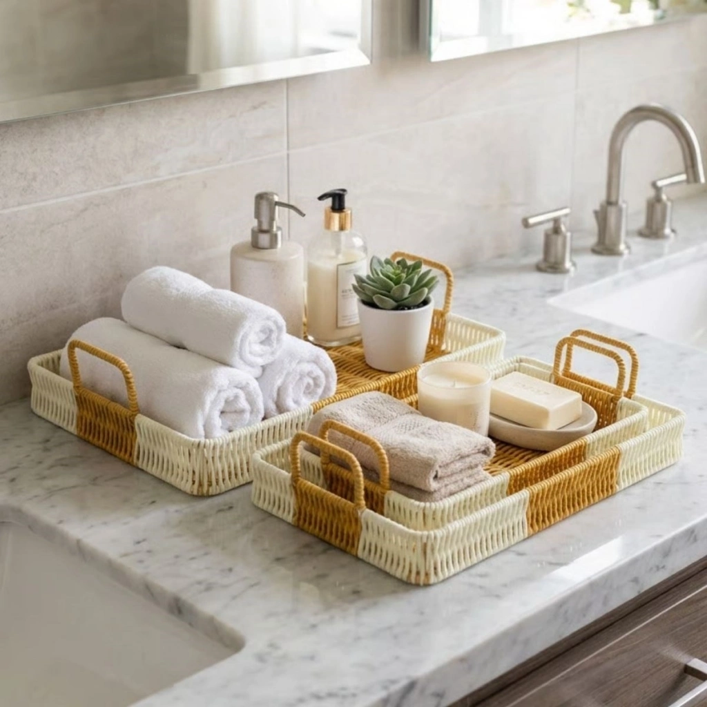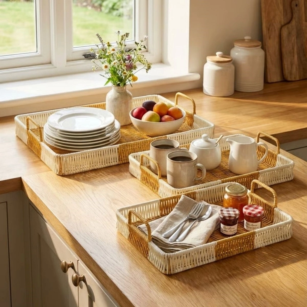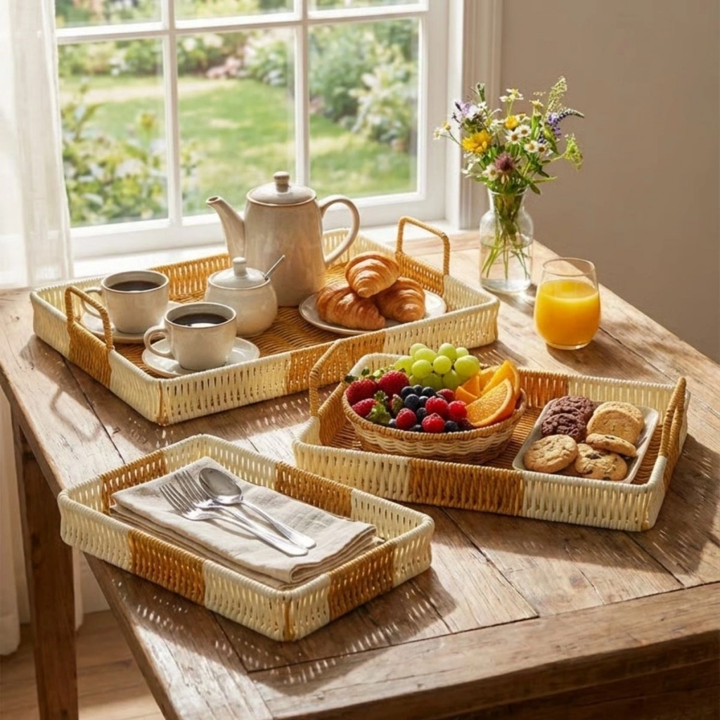 Plastik Rattan İç İçe Geçebilen 3’lü Dikdörtgen Tepsi Seti – Çift Renkli, Dayanıklı ve Çok Amaçlı Sunum Tepsileri