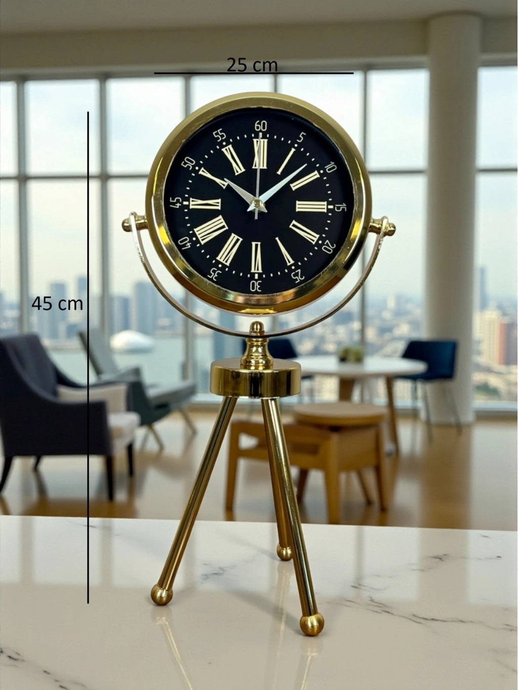 45 x 25 cm ölçülerindeki bu şık gold üç ayaklı masa saati, modern ve zarif tasarımıyla bulunduğu ortama premium bir görünüm kazandırır. Gerçek cam korumalı kadranı sayesinde hem net bir görünüm sunar hem de darbelere karşı daha dayanıklıdır. Metal tripod ayak yapısı ile dekoratif bir obje olarak da dikkat çeker. Sessiz çalışan mekanizmasıyla ev, ofis ve çalışma alanlarında keyifli bir kullanım sağlar.
