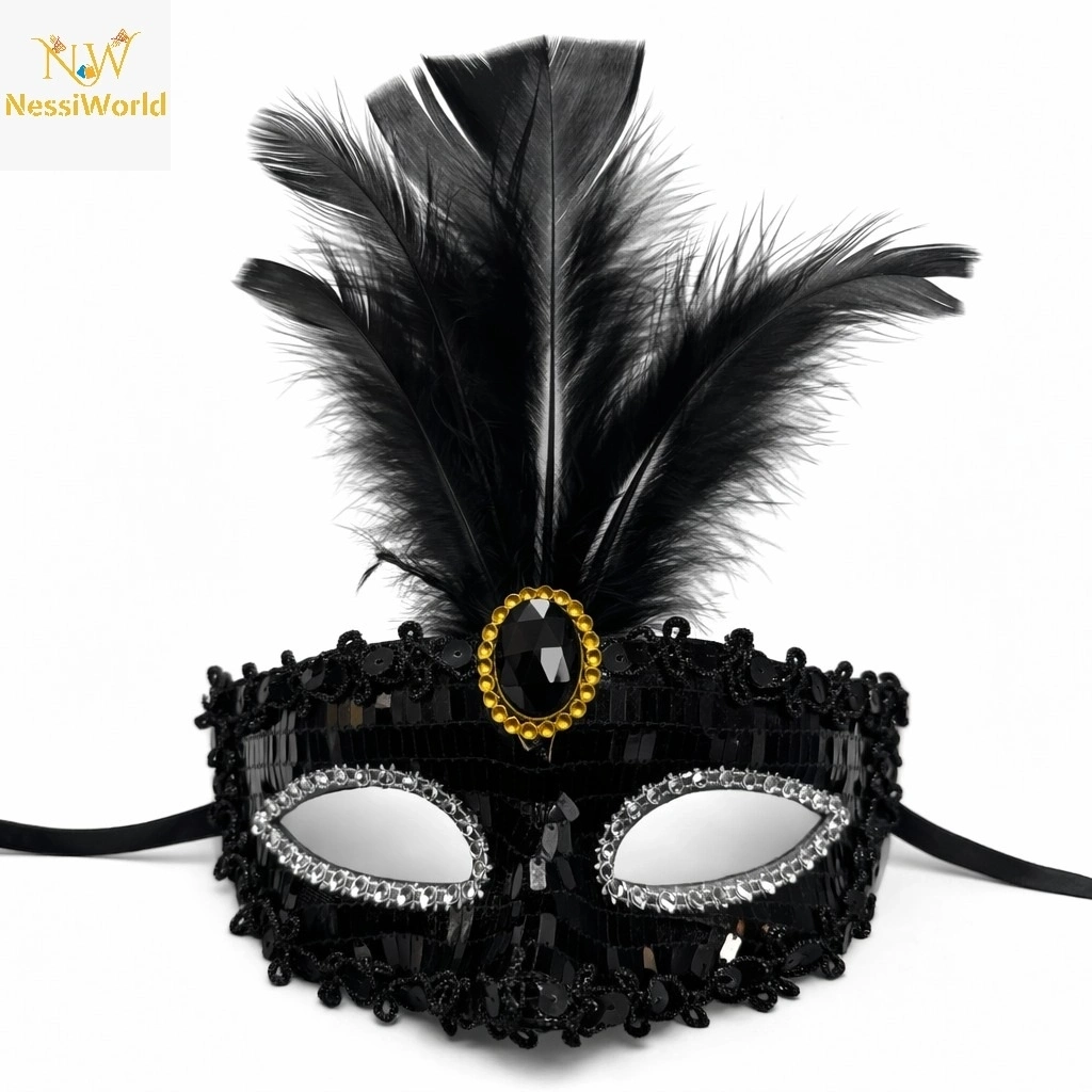 Lüks Siyah Tüylü Taşlı Balo Maskesi