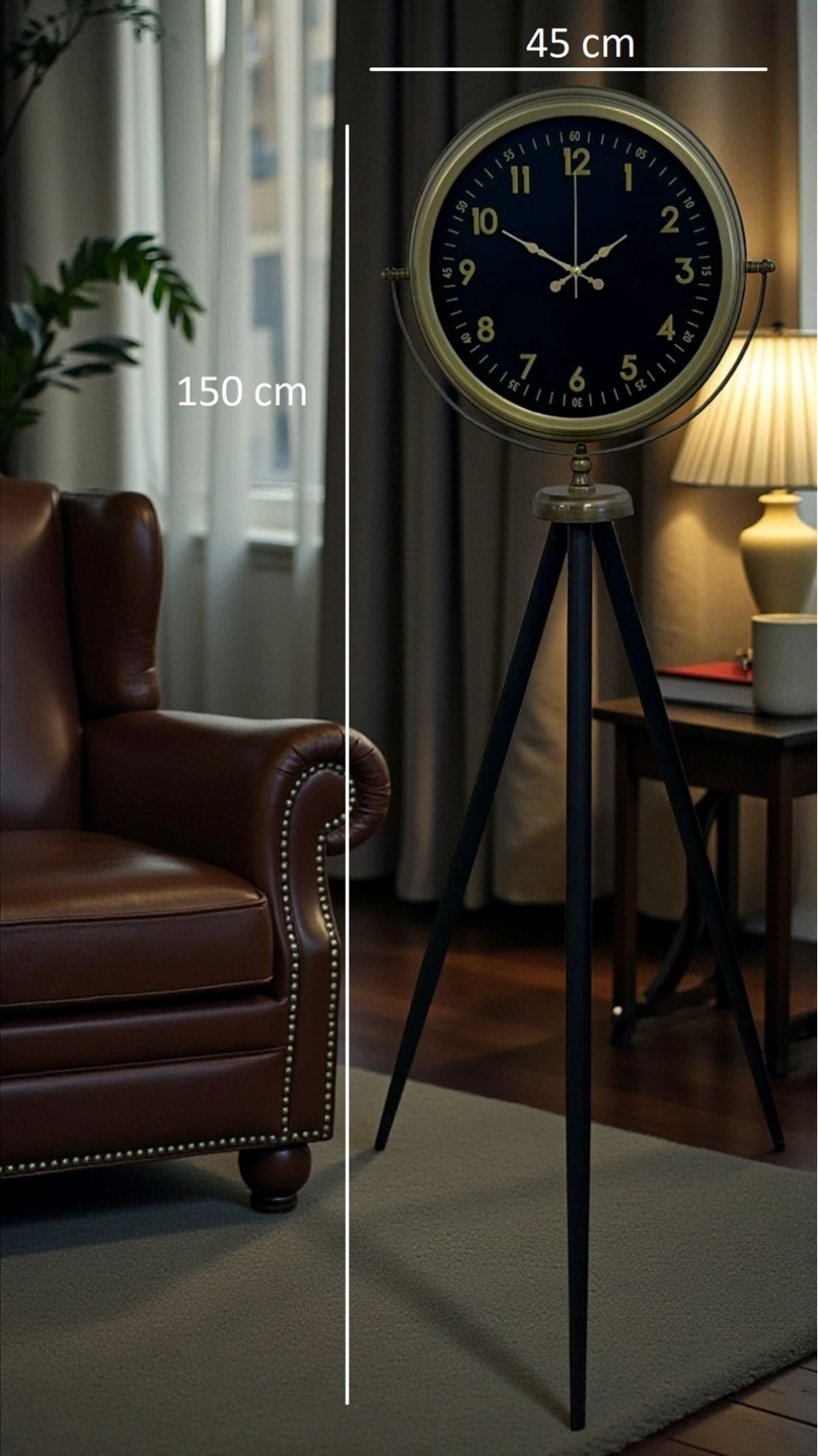 Evinize, ofisinize ya da konsept mekânlarınıza güçlü bir “dekor objesi” etkisi katacak Eskitme Tripod Ayaklı Salon Saati, klasik saat tasarımını modern bir duruşla buluşturur. 150 x 45 cm ölçüsü sayesinde bulunduğu ortamda hemen dikkat çeker; özellikle salon, antre, loft tarzı yaşam alanları, kafe/restoran dekorları ve yönetici odalarında şık bir tamamlayıcı olur.