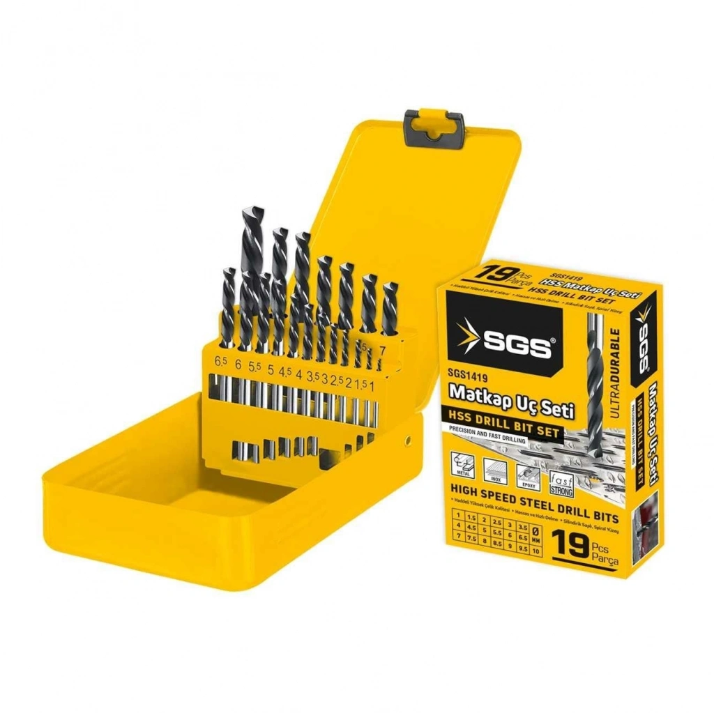 SGS 19 Parça HSS Matkap Ucu Seti, haddeli yüksek çelik kalitesi ve özel tasarımıyla profesyonel ve amatör kullanıcılara üstün performans sunar.