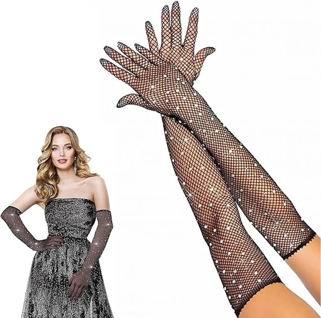 Siyah Renk İncili Elmas İşlemeli File Örgü Uzun Eldiven 45 cm