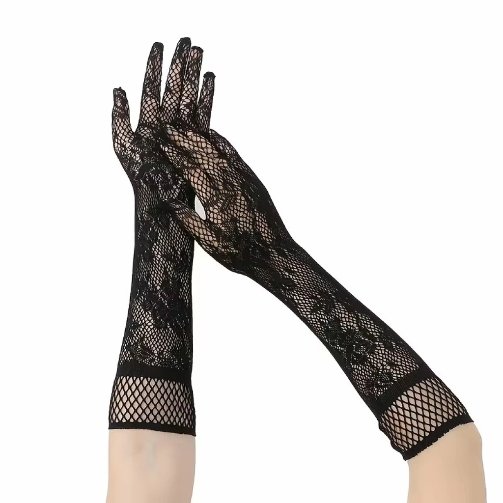 Siyah Uzun Gül Desenli Dantel Kadın Eldiveni