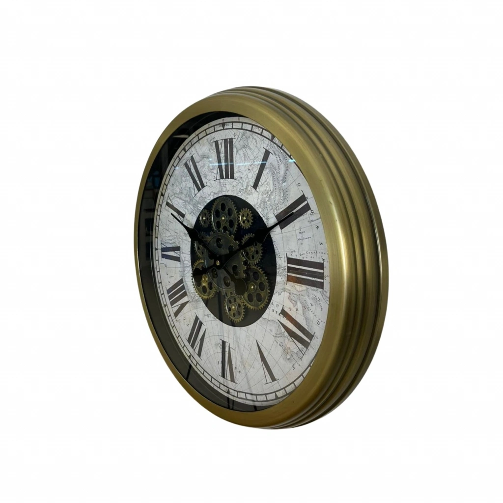 Harita desenli özel kadranı, klasik Roma rakamları ve merkezde yer alan hareketli çark detayıyla tasarlanan bu 60 cm duvar saati; zamana keşif ruhu ve nostaljik bir karakter kazandırır.