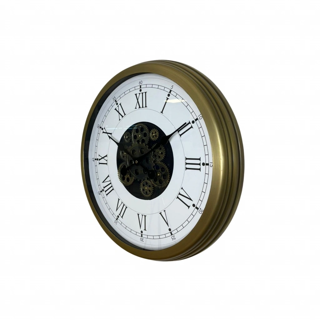 Beyaz kadranı, zarif Roma rakamları ve merkezde yer alan hareketli çark detayıyla tasarlanan bu 60 cm duvar saati; klasik çizgiyi modern dokunuşla birleştirir. Gold tonlu metal çerçevesi ürüne şık ve premium bir görünüm kazandırırken, sade tasarımı sayesinde her dekorasyon stiline kolayca uyum sağlar.