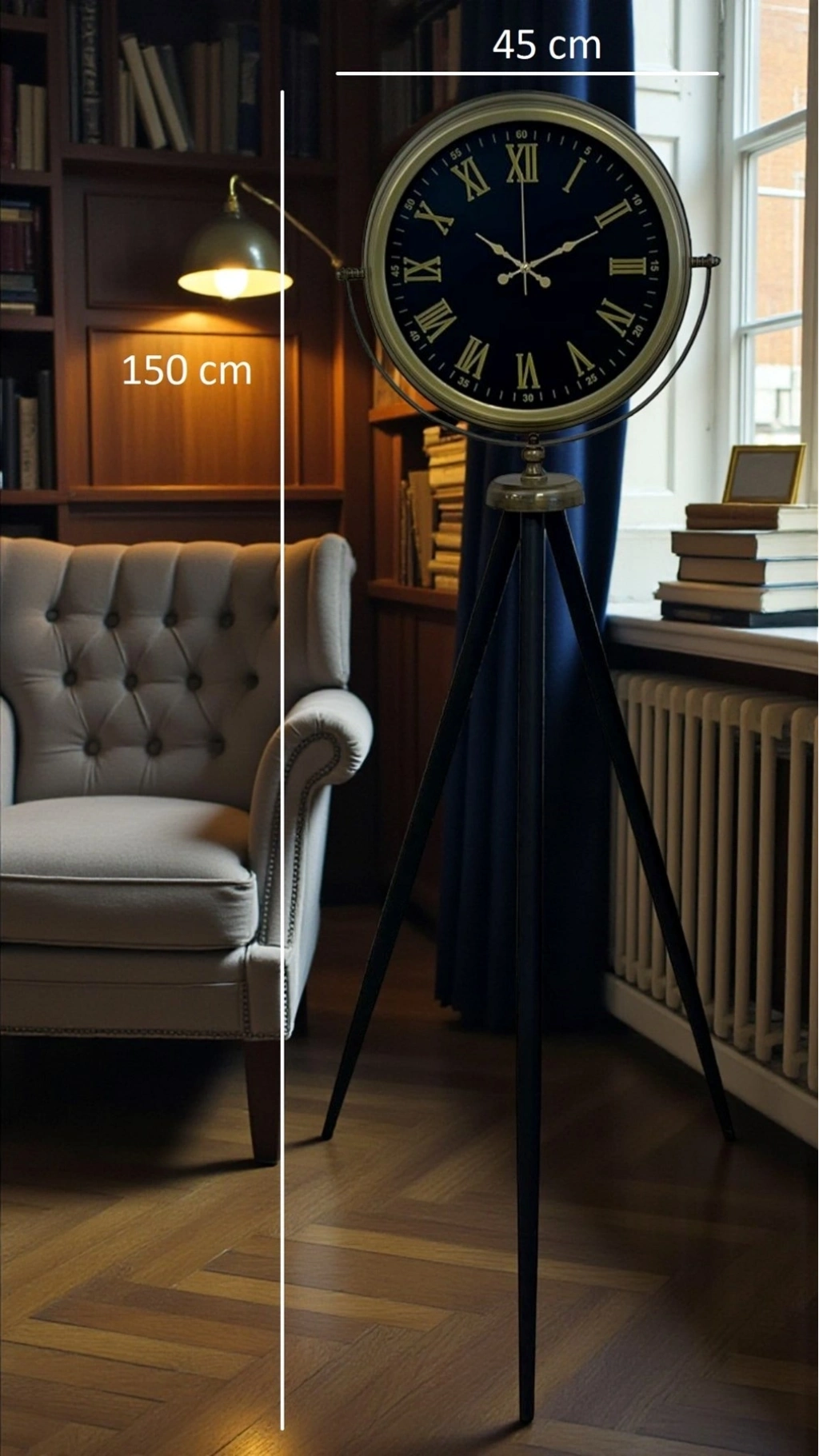 150 cm yüksekliği ile geniş alanlarda dahi etkileyici bir duruş sergileyen bu özel saat; salon, ofis, otel lobisi, kafe, restoran ve showroom gibi alanlarda dekoratif bir obje olarak öne çıkar. Eskitme görünümlü metal detaylar, saate nostaljik bir ruh kazandırırken siyah tripod ayaklar modern çizgiyi dengeler.