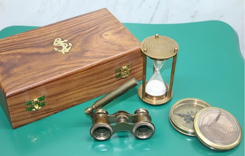 Ahşap Kutulu Pirinç Pusula, Kum Saati, Dürbün Seti