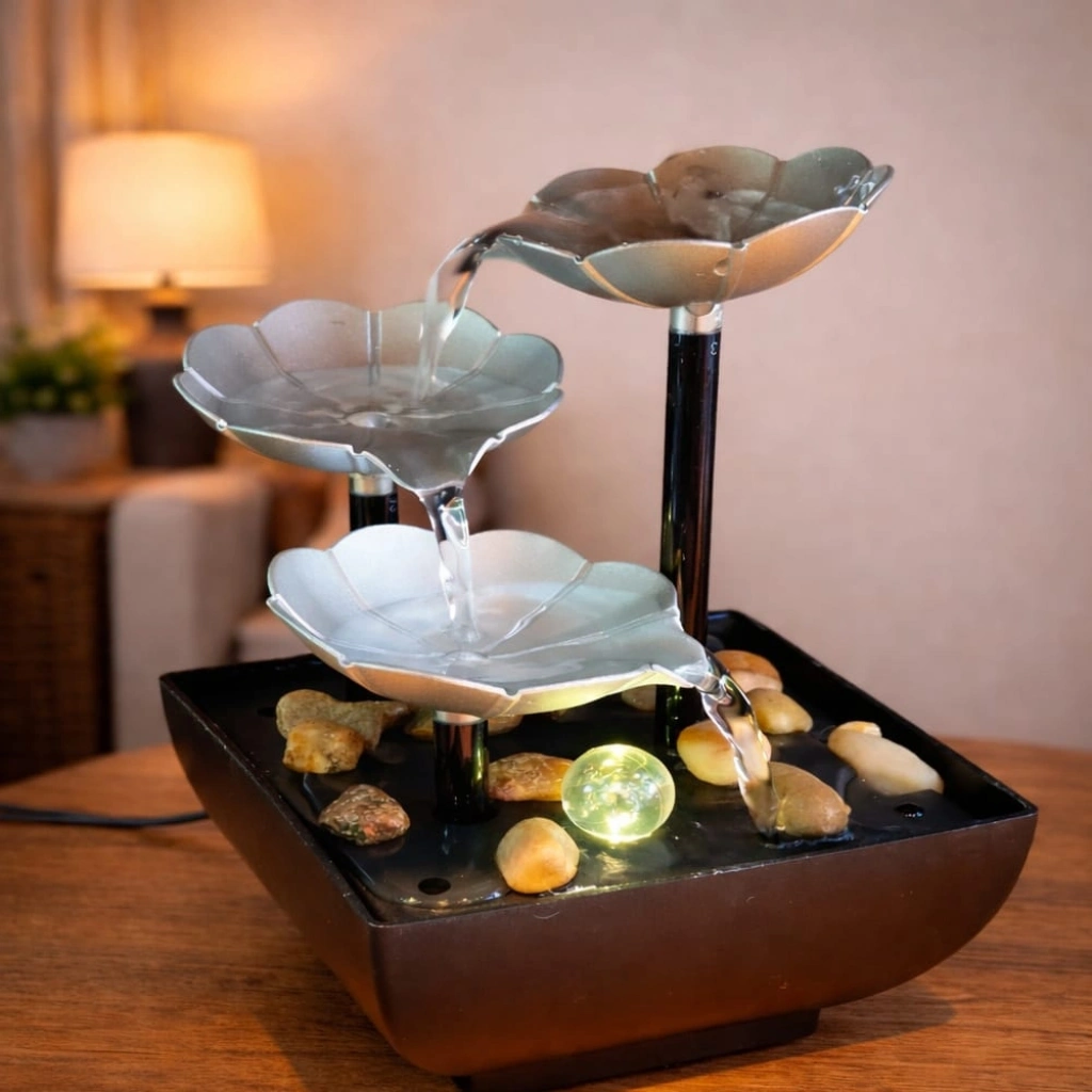 GÜMÜŞ ÇİÇEK TASARIMLI LED IŞIKLI SU ŞELALESİÜrün ÖzellikleriYaşam alanlarınıza gümüşün zarafetini ve suyun dinlendirici gücünü taşıyın! Gümüş Çiçek Tasarımlı LED Işıklı Su Şelalesi, modern estetiği huzur veren bir sesle buluşturan mükemmel bir dekorasyon parçasıdır. 22 cm x 11.5 cm boyutlarındaki bu şık obje, yüksek kaliteli sert malzemeden üretilen dayanıklı yapısı ve gümüş rengi çiçek basamaklarıyla lüks bir duruş sergiler. USB bağlantısı ile çalışan sistemi, havuz kısmına eklenen suyla birlikte hafif ve huzurlu bir motor sesi eşliğinde su devirdaimine başlar. Şelalenin merkezindeki renk değiştiren LED ışıklı kristal küre, suyun hareketiyle dönerek ortamda büyüleyici bir yansıma oluşturur. Paket içeriğinde yer alan doğal dekoratif taşlar, taban kısmında organik ve şık bir görünüm tamamlar. Masanızda, ofisinizde veya evinizin her köşesinde odak noktası olacak bu şelale, hem stres atmanıza yardımcı olur hem de sevdikleriniz için prestijli bir hediye alternatifidir.Ürün Teknik ÖzellikleriÖzellikAçıklamaBoyutlar22 cm (Yükseklik) x 11.5 cm (Genişlik)MalzemeYüksek Kaliteli, Dayanıklı Sert PolimerGüç KaynağıUSB Kablosu (Kullanım kolaylığı sağlar)AydınlatmaRenk Değiştiren LED Işıklı Kristal KüreÇalışma PrensibiSessiz Devirdaim Motorlu (Su ile çalışır)Kullanım AlanıOfis Masası, Ev Dekorasyonu, Gece Lambası, MeditasyonTasarımGümüş Çiçek Katmanlı Modern StilPaket İçeriği1 Adet Gümüş Çiçek Tasarımlı Su Şelalesi
