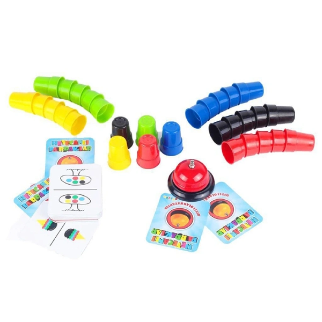HEYECANLI BARDAKLAR OYUNUHeyecanlı Bardaklar Oyunu, amacı kutudaki görev kartlarındaki talimatları en hızlı şekilde yerine getirmek olan bir oyun. Oyun içeriği, 30 bardak (beş farklı renkte, toplam 6 set), 50 resimli görev kartı, 10 özel soru kartı ve 1 zilden oluşur. Her oyuncu 5 renkten oluşan bir bardak seti alır ve önüne dizip, kartlar karıştırılır. Zil oyun alanının ortasına konulur. Oyunculardan biri hızlıca bir kartı çevirir, diğer oyuncular da görevdeki bardakları doğru sırayla dizer. En hızlı bitiren oyuncu zile basarak oyun kartını kazanır. Kartlar bitince oyun tamamlanır ve en fazla kartı toplayan oyuncu oyunu kazanır.Oyunun heyecanını artıran bir detay ise hızlı düşünme ve el becerilerini kullanma becerisinin ön plana çıkmasıdır. Oyuncular, görev kartındaki şekilde bardakları düzenlerken rekabetçi bir atmosferde heyecan dolu anlar yaşarlar. Zilin rolü, oyunun hızını ve dinamiklerini kontrol etmeye yardımcı olur.Heyecanlı Bardaklar Oyunu, sosyal etkileşimi artırarak arkadaşlar arasında keyifli bir rekabet ortamı yaratmayı amaçlar. Renkli bardaklar ve görev kartlarıyla çeşitlilik sunarak her oyunun farklı ve eğlenceli geçmesine olanak tanır. Oyunun basit kuralları ve hızlı tempolu yapısıyla her yaş grubundan oyuncuya hitap eder.Paket İçeriği1 adet heyecanlı bardaklar oyunu