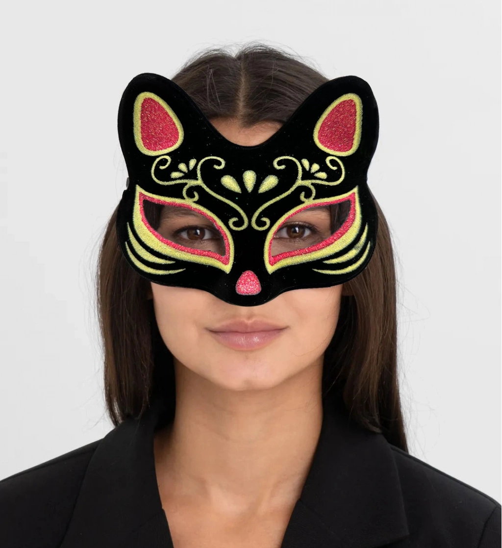 Siyah Süet Kırmızı Sarı Simli Kedi Maskesi