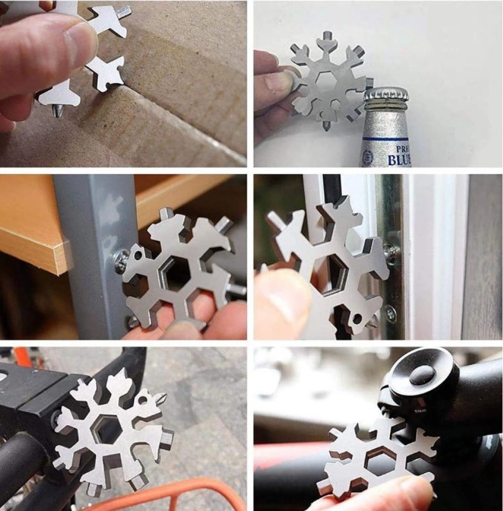 Kar Tanesi Çok Amaçlı Anahtarlık AçacakÜrün ÖzellikleriKar tanesi anahtarları son derece çok yönlüdür. Şişe açacağı, kutu açacağı, tornavida, emniyet çekiç, altıgen anahtar vb. Olarak kullanılabilir.18+1 çeşit düz yıldız tornavida, alyan, civata anahtarı, meşrubat açacağı, koli kesme gibi bir çok işlerinizi tek ürünle çözebilirsiniz.Avuç içine sığan küçük boyutu ile cebinizde veya çantanızda kolaylıkla taşıyabilirsiniz.Paslanmaz çelikten üretilmiştir.Her evde, araçta ve özellikte bisiklette motosiklet gibi ulaşım araçlarında bulunması gereken müthiş bir ürün.Dağcılık veya yürüyüş gibi açık hava sporlarında yanınıza almalısınız. Paket İçeriği1 Adet Kar Tanesi Çok Amaçlı Anahtarlık Açacak