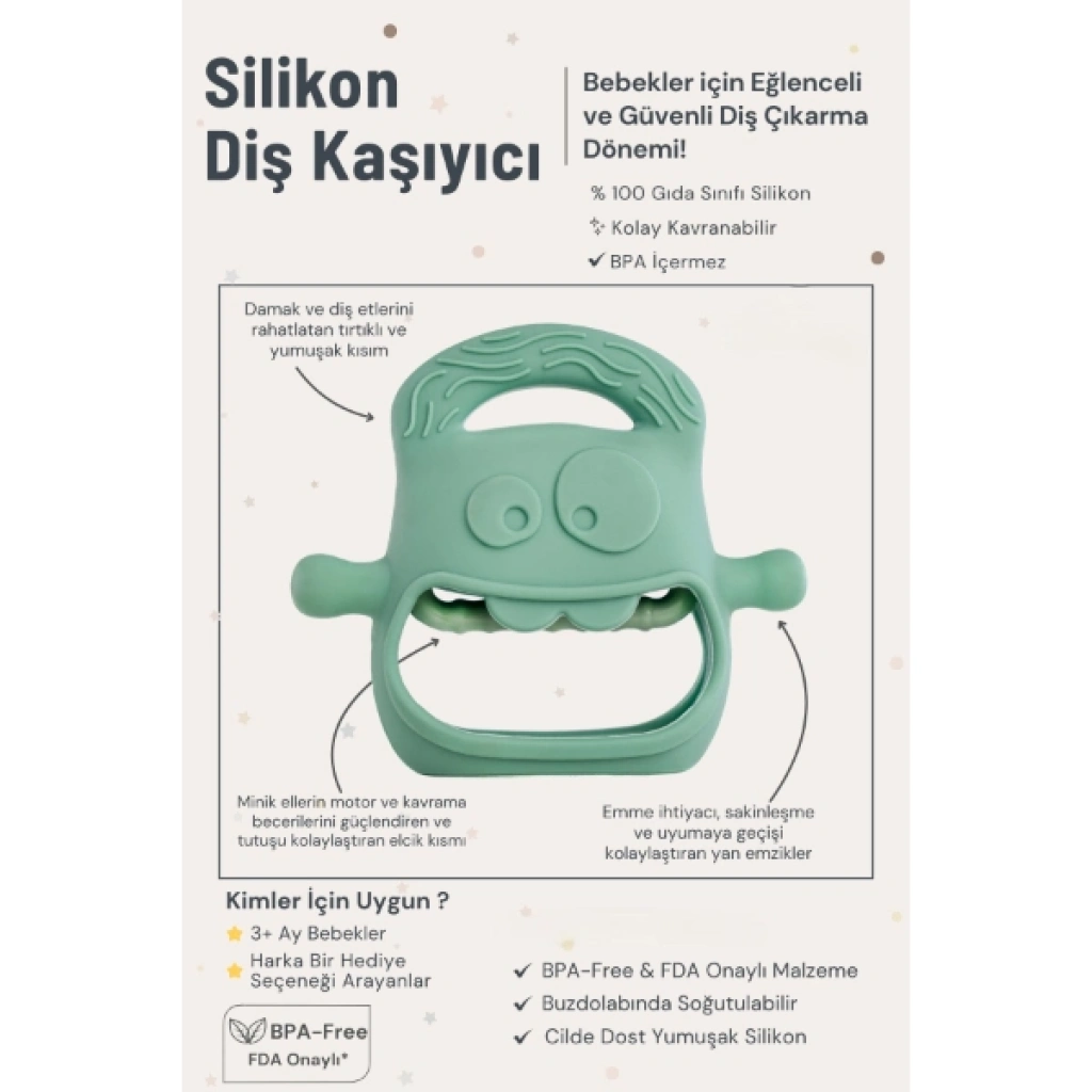 KOYU YEŞİL BEBEK SİLİKON DİŞ KAŞIYICIÜrün ÖzellikleriKoyu yeşil silikon bebek diş kaşıyıcı, diş çıkarma döneminde bebeklere hem rahatlatıcı hem de eğlenceli bir deneyim sunar. Modern tasarımı, farklı dokulara sahip yüzeyleri ve ergonomik tutma alanları sayesinde minik eller için kolay kavranabilir yapıdadır. Hassas diş etlerini nazikçe masaj yaparak yatıştırır ve bebeklerin sakinleşmesine yardımcı olur.Çift yönlü emzik kolları, bebeklerde doğal emme refleksini desteklerken parmak emme alışkanlığının önüne geçer. Aynı zamanda çene kaslarını çalıştırarak ağız ve çene gelişimine katkı sağlar. Hafif ve esnek yapısı ile bebekler kolayca tutabilir.Bu diş kaşıyıcı yalnızca rahatlatıcı değil, aynı zamanda motor ve duyusal gelişimi destekleyen bir oyun arkadaşıdır. Farklı yüzey dokuları dokunsal keşfi teşvik ederken kavrama becerisini geliştirir. Gıda sınıfı medikal silikon malzemeden üretilmiş olup BPA, BPS ve zararlı kimyasallar içermez. Yeni doğan döneminden itibaren güvenle kullanılabilir.Paket İçeriği1 adet Koyu Yeşil Bebek Silikon Diş Kaşıyıcı