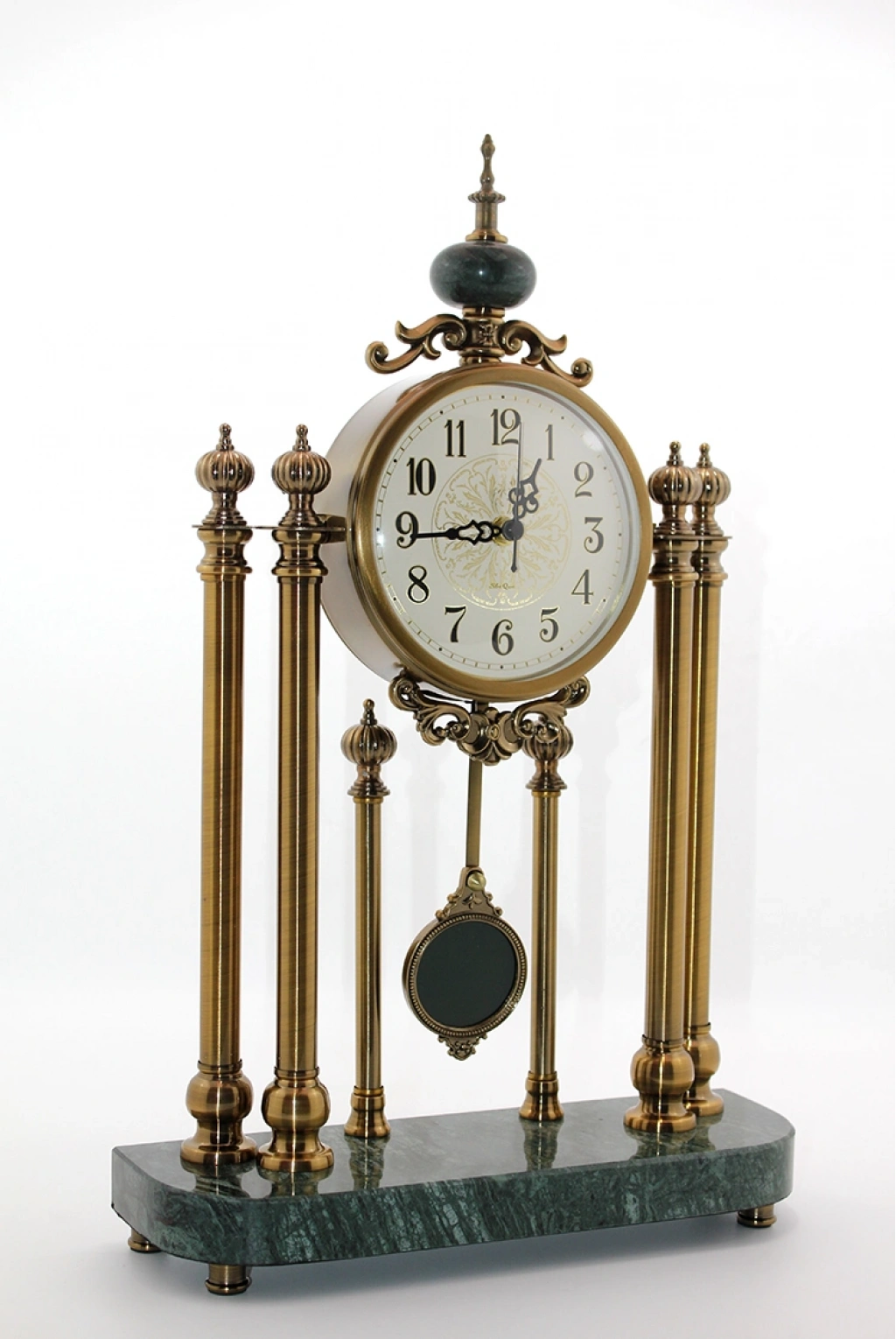 MASAÜSTÜ SARKAÇLI SAAT Ürün ÖzellikleriMasaüstü sarkaçlı saat, zarif ve klasik tasarımıyla bulunduğu ortama estetik bir hava katar. 1. derece kaliteli metal malzemeden üretilmiş gövdesi dayanıklılık sunarken, alt kısmında kullanılan mermer taban sağlamlık ve şıklığı bir arada sunar. 42x28 cm ölçüleriyle masa veya raf üzerinde dikkat çekici bir dekoratif obje olarak öne çıkar. Sarkaçlı tasarımı sayesinde nostaljik bir etki yaratarak hem ev hem de ofis dekorasyonuna uyum sağlar.Paket İçeriği1 adet Masaüstü Sarkaçlı Saat