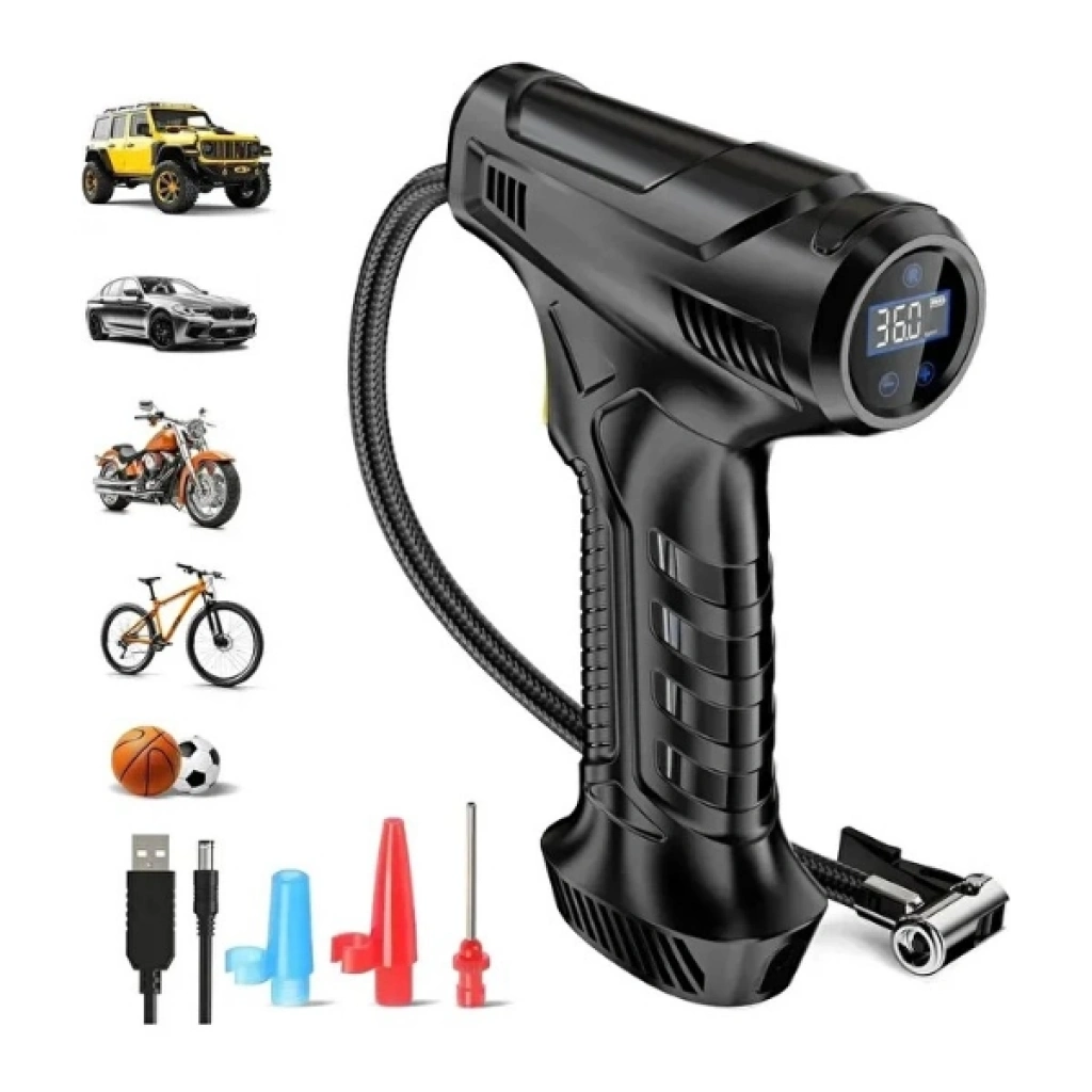 ŞARJLI EL TİPİ HAVA KOMPRESÖRÜÜrün ÖzellikleriŞarjlı el tipi hava kompresörü kompakt yapısıyla kolay taşınabilir ve pratik kullanım sağlar. 3600 mAh bataryaya sahip olan cihaz, güçlü 120 W motoru sayesinde hızlı şişirme imkanı sunar. Dijital ekranlı tasarımıyla basınç değerlerini net bir şekilde gösterir ve kullanım kolaylığı sağlar. Araç lastikleri, bisiklet, motosiklet, top ve çeşitli şişme ürünlerde rahatlıkla kullanılabilir. USB üzerinden şarj edilebilir yapısıyla enerji tasarrufu sunar ve farklı uç adaptörleri sayesinde çok yönlü bir kullanım sağlar.Paket İçeriği1 adet Şarjlı El Tipi Hava Kompresörü