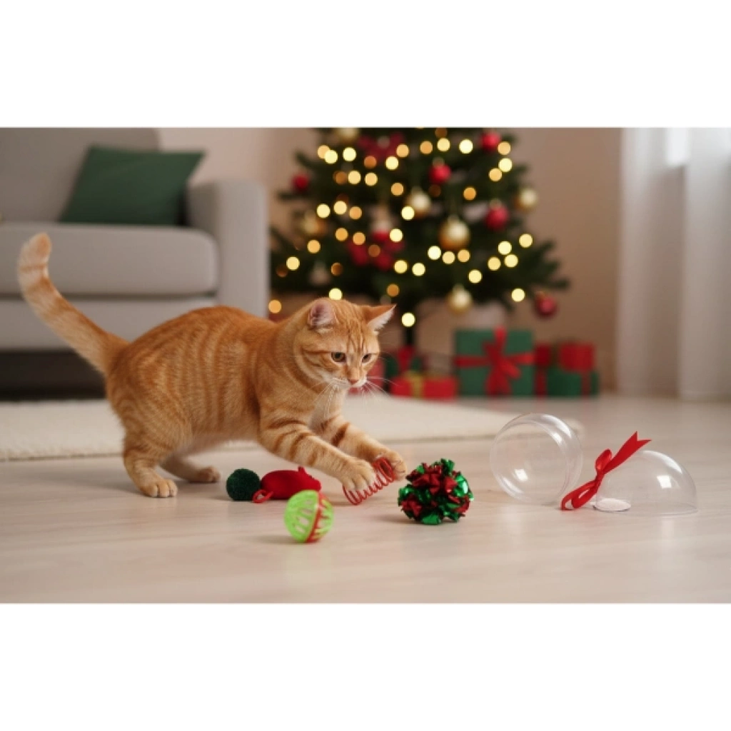 YILBAŞI KONSEPTLİ 8 PARÇA KÜRE İÇİNDE OYUNCAK SETİÜrün ÖzellikleriYılbaşı Konseptli 8 Parça Küre İçinde Oyuncak Seti, kedinizin oyun içgüdüsünü canlandıran renkli ve eğlenceli parçalarıyla hem görsel hem de işlevsel bir oyun deneyimi sunar. Her bir oyuncak, yılbaşı temasına uygun olarak kırmızı–yeşil tonlarında tasarlanmış olup kedinizi harekete geçirecek farklı doku ve şekillere sahiptir. Setin içinde zilli toplar, spiral yay oyuncaklar, ponponlar ve küçük peluş sürpriz parçalar yer alarak kedinizin sıkılmadan uzun süre oyun oynamasını sağlar. Şeffaf küre ambalajı hem şık bir sunum hem de saklama kolaylığı sağlar; ayrıca yılbaşı döneminde hediye alternatifi olarak da ideal bir üründür. Hafif ve dayanıklı malzemelerle üretilen oyuncaklar, kedinizin enerjisini sağlıklı bir şekilde atmasına katkıda bulunur.Paket İçeriği1 adet şeffaf küre içinde 8 parça yılbaşı temalı kedi oyuncağı