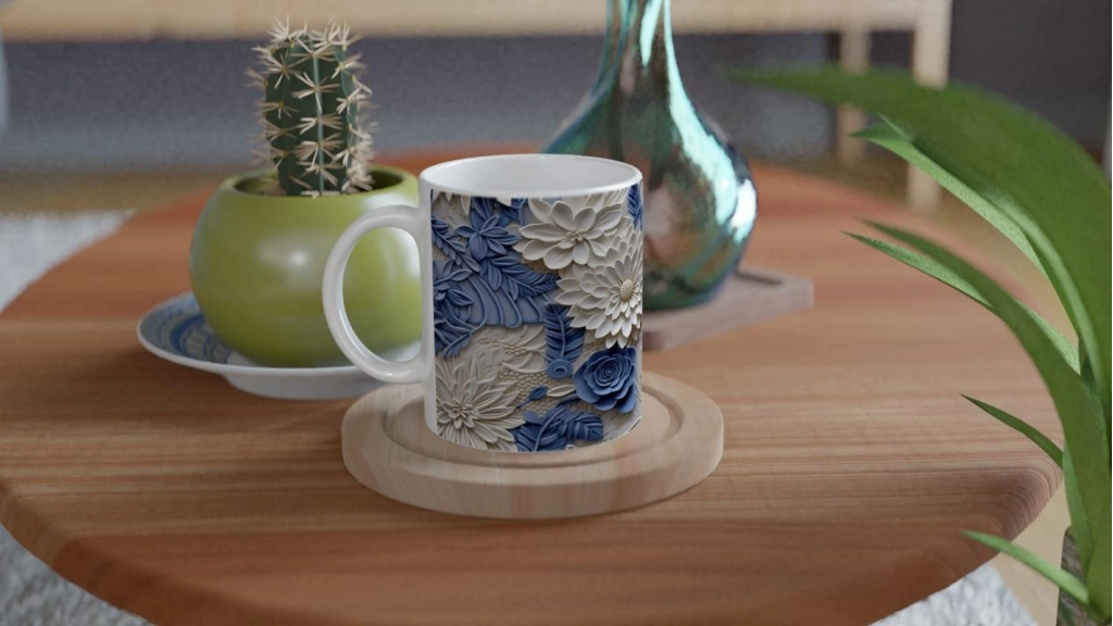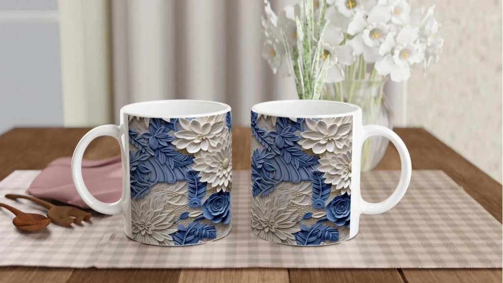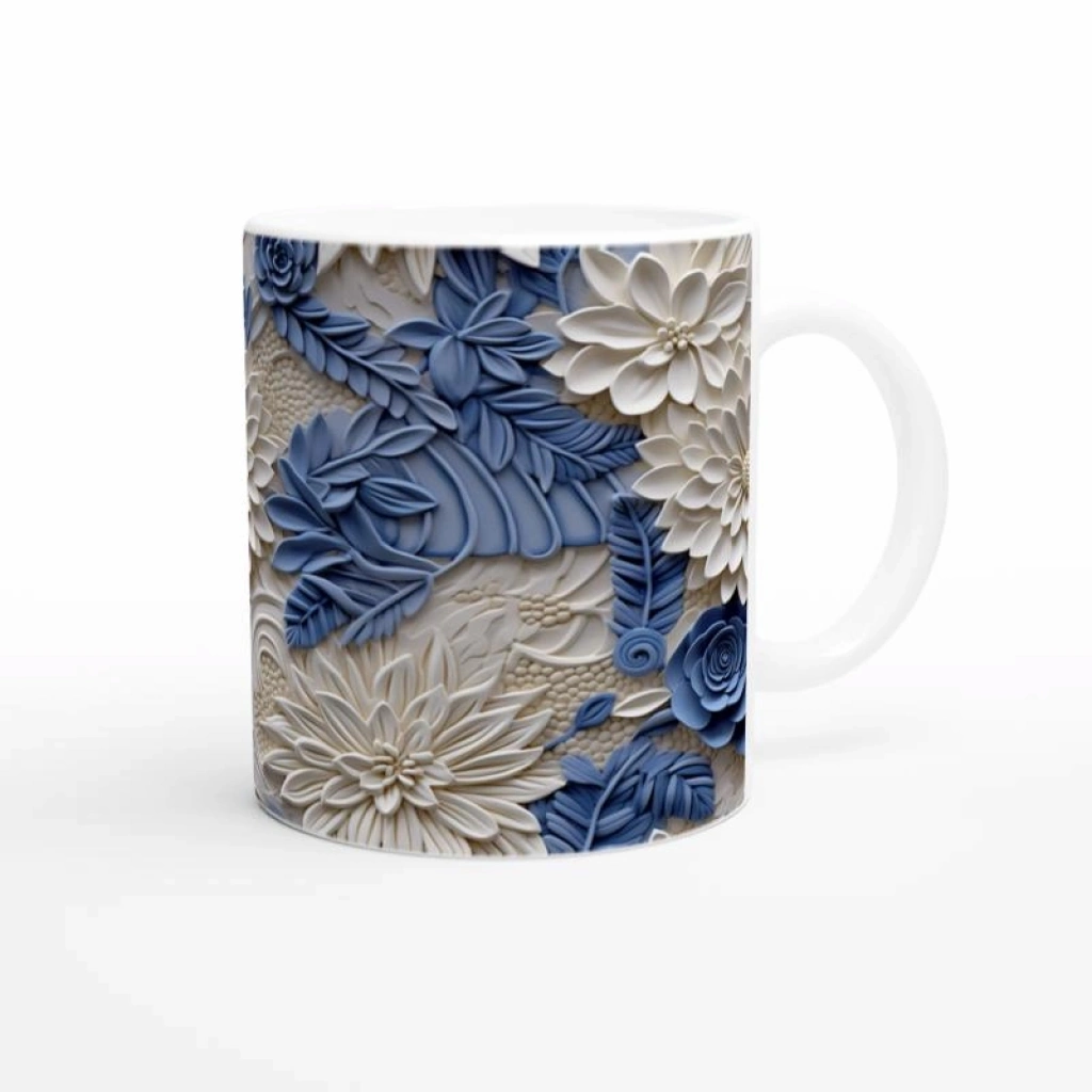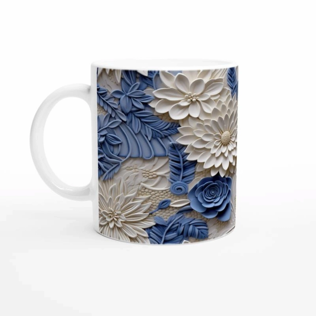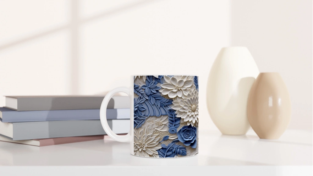 İnci beyazı çiçek motifleri ve pastel mavi yaprak desenleriyle zenginleştirilmiş bu rölyef tarzı kupa bardak, zarif ve şık bir atmosfer yaratmak isteyenler için özel olarak tasarlandı.