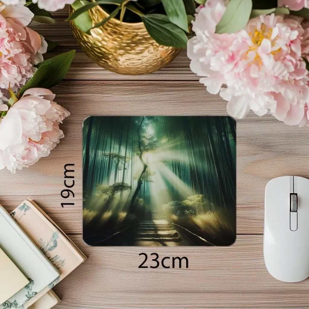 Işık süzmelerinin arasından görünen bambu ormanı tasarımı, bu mouse pad’i doğa ile içsel bir bağlantı kurmak isteyenler için ideal hale getirir.