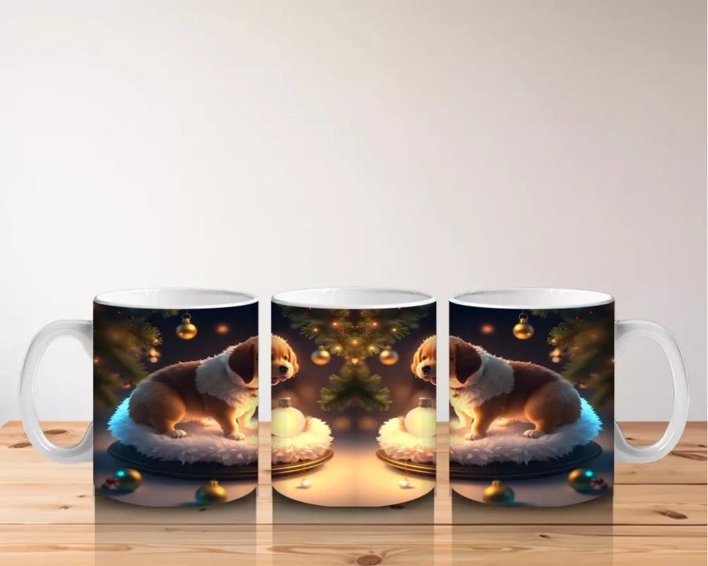Işıltılı mumlar eşliğinde poz veren yavru köpek, sıcak ve samimi bir görünüm sunuyor. Romantik ve neşeli detayları sevenler için ideal bir kupa.