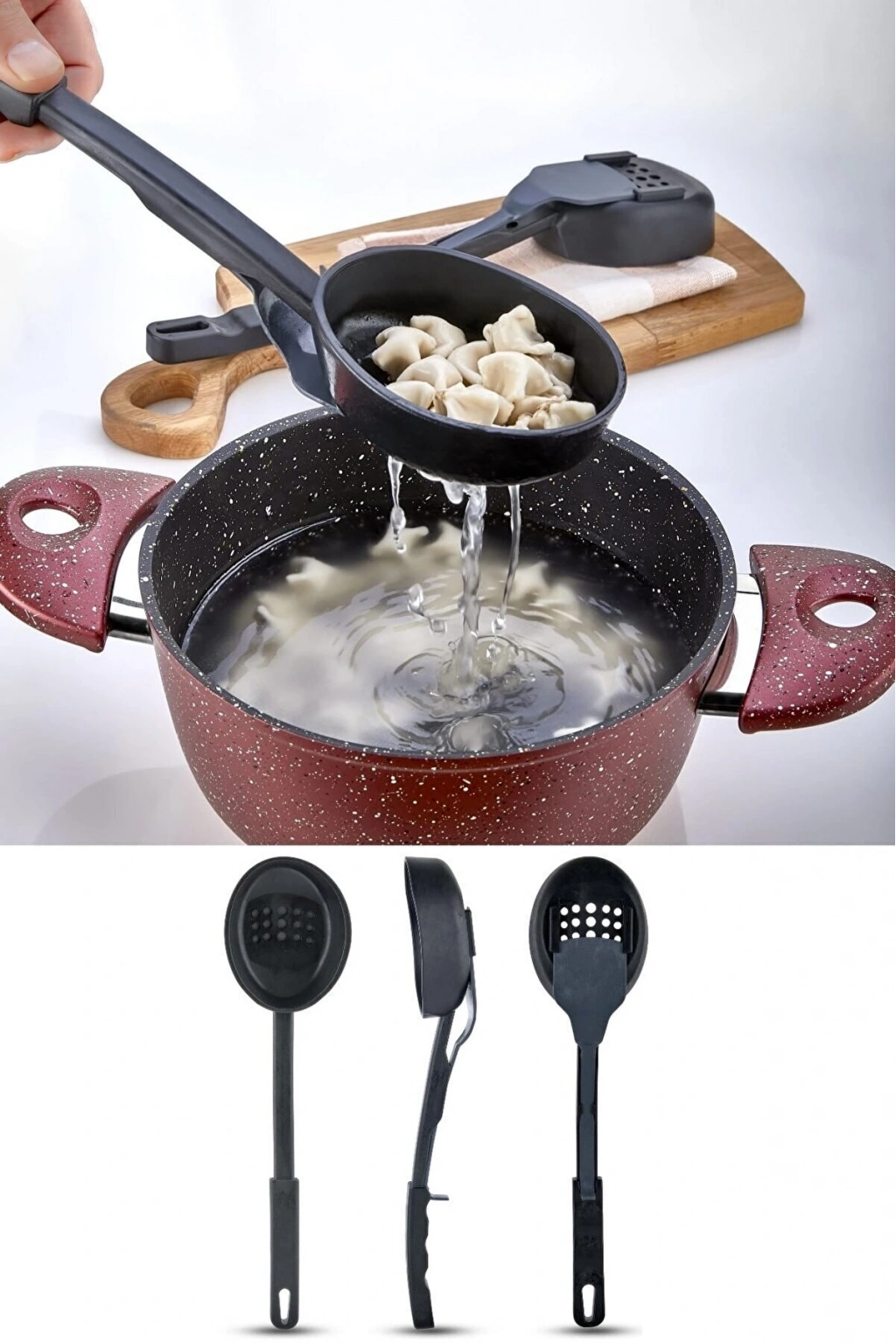 Isıya Dayanıklı 3 İn 1 Servis Kepçesi - Kepçe Kevgir Kaşık 3'ü Bir Arada Servis Seti