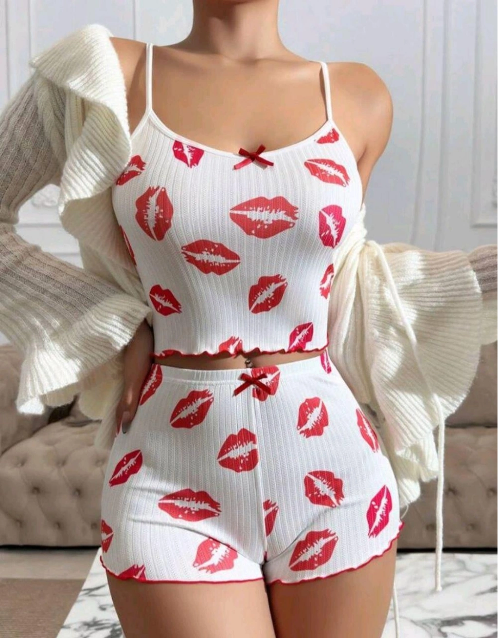Beyaz dudak desenli bu gecelik takımı, eğlenceli ve dikkat çekici bir tasarıma sahiptir. Hafif kumaşı ile rahat kullanım sunarken enerjik bir stil yaratır.