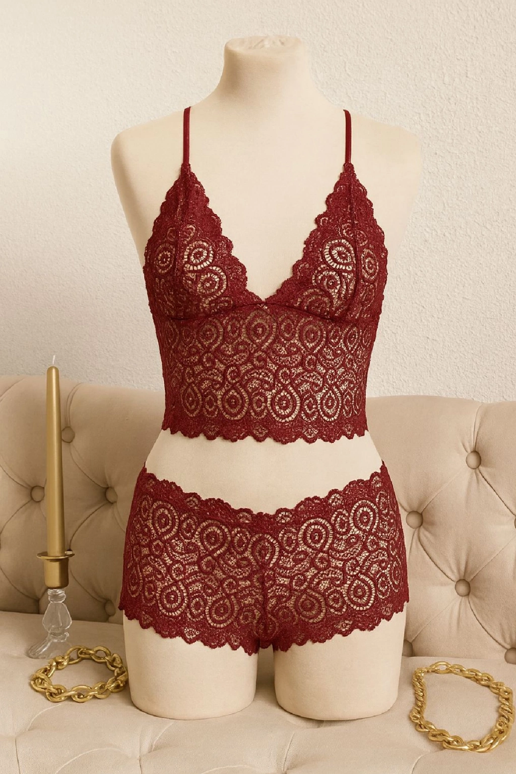 • Asaletin ve zarif şıklığın buluştuğu bordo dantel bralet şort takımı, sofistike görünümüyle fark yaratır.