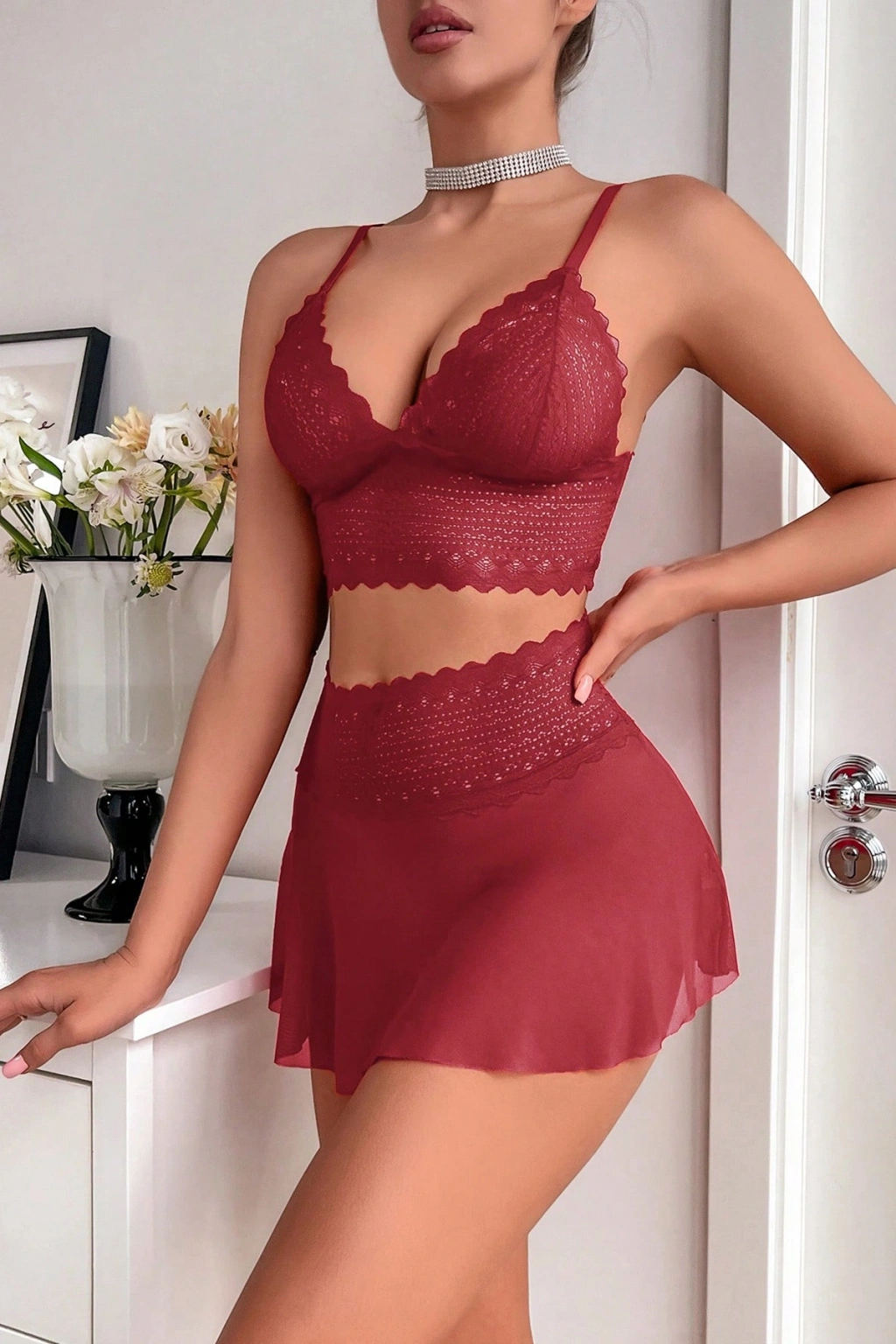 • Kırmızı Beli Dantelli Tül Etek ve Braletli Gecelik Takımı