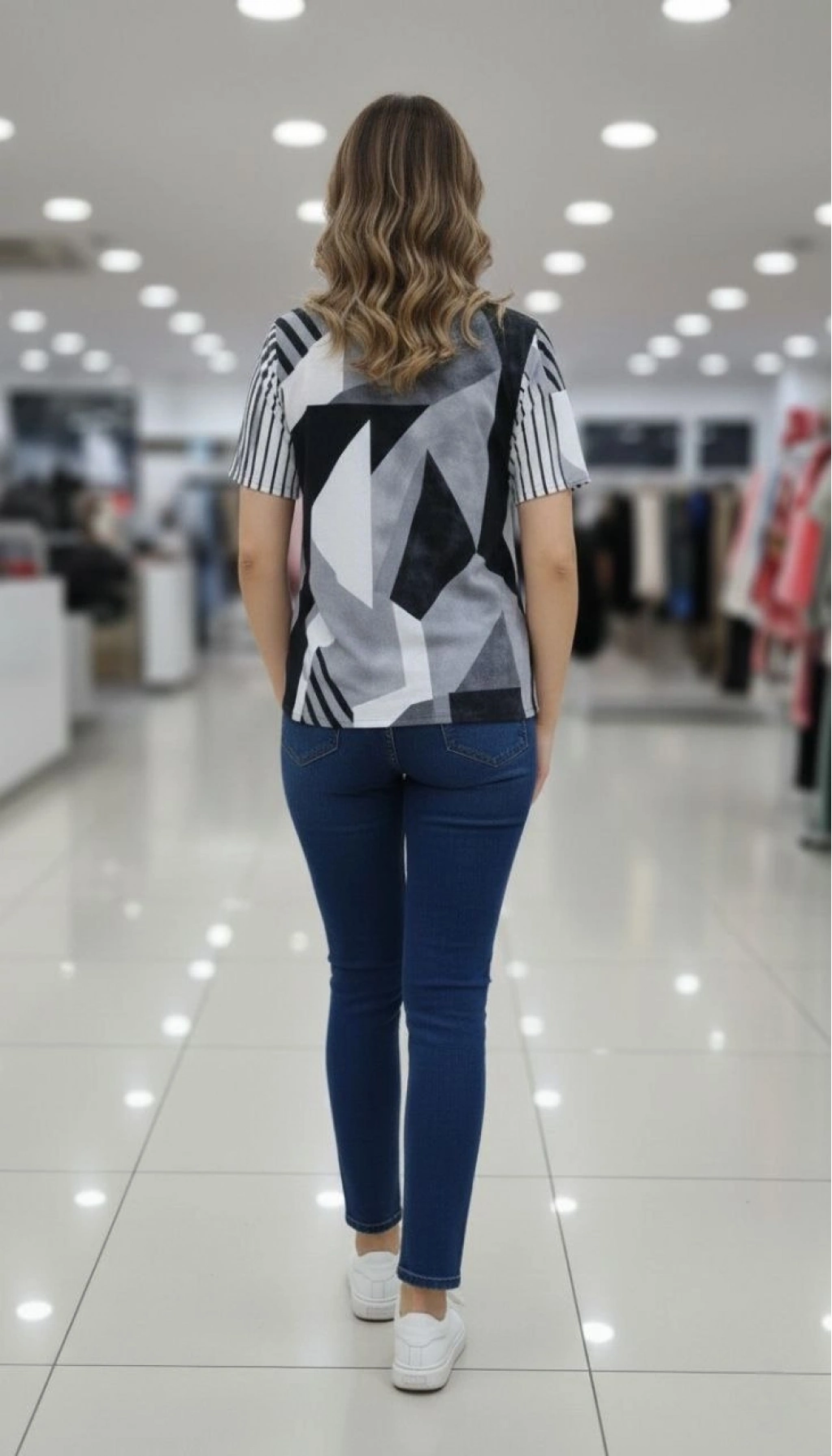 Kadın Desenli Püsküllü Viskon Bluz Bebe Yaka Kısa Kollu Big Size Rahat Kesim - Desenli