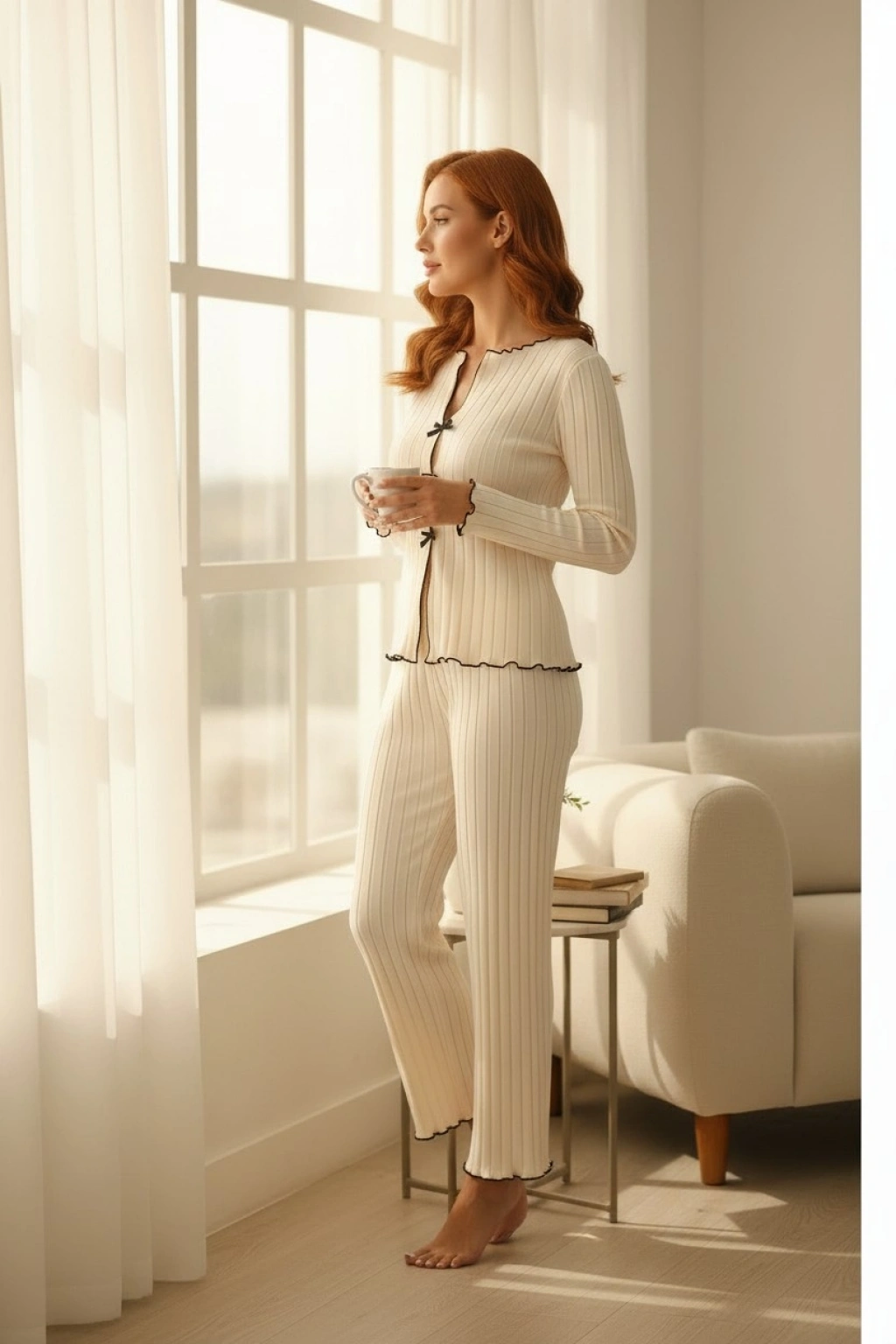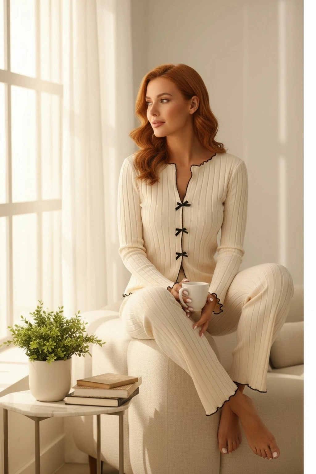 Kadın Ekru Fitilli Şık Pijama Takımı – Fiyonk Detaylı Rahat Ev Giyim Seti