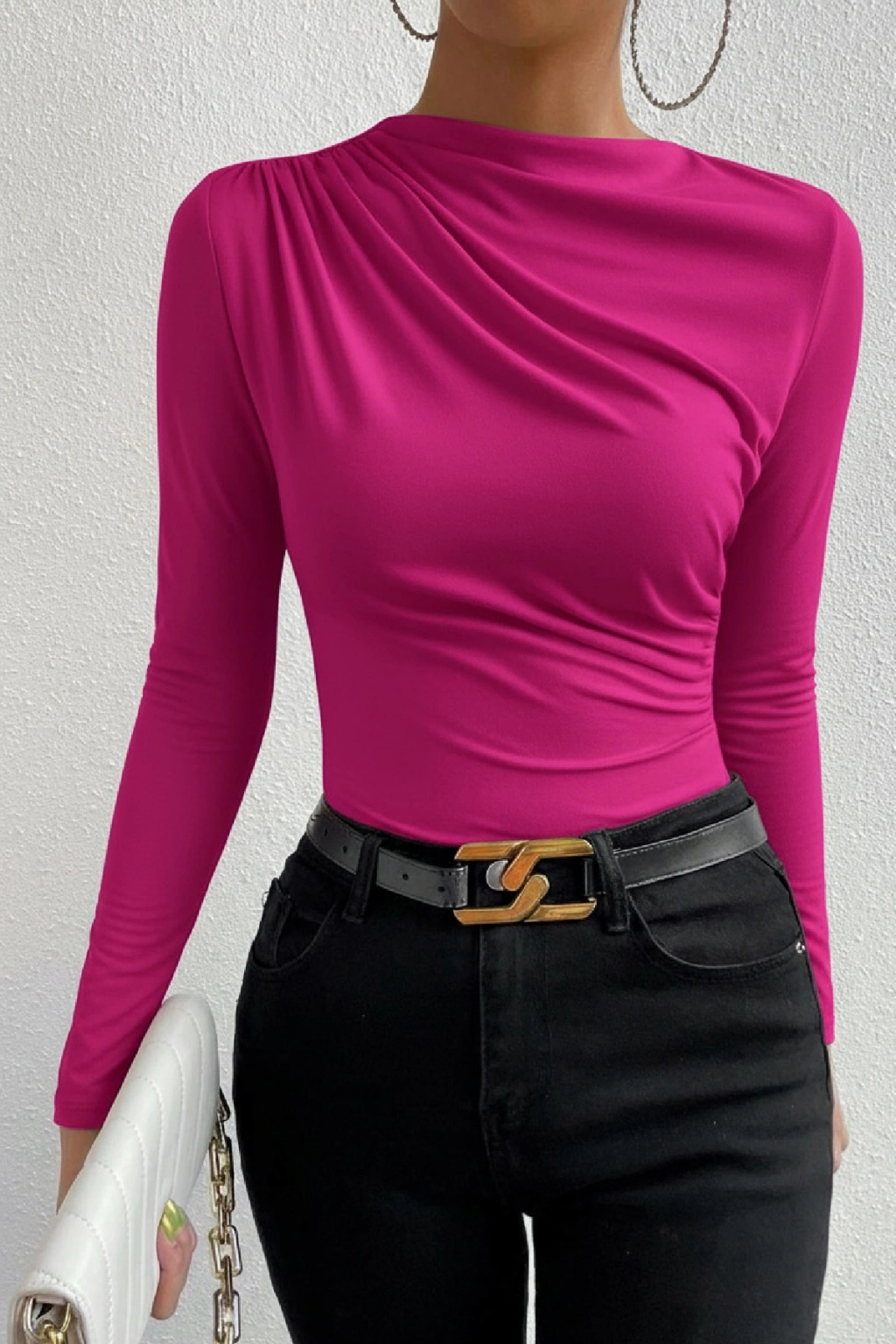 Kadın Fuşya Belden ve Boyundan Büzgü Detaylı Uzun Kollu Bluz