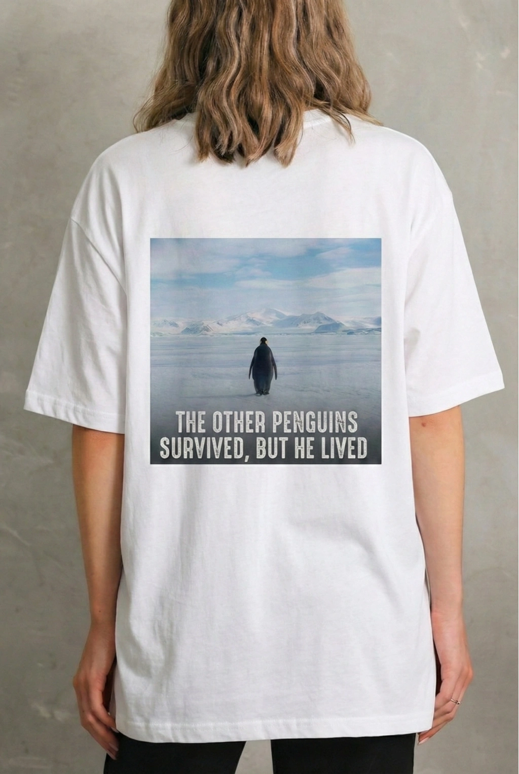 Kadın Oversize Tişört - Sırt Baskılı "Survivor Penguin" Temalı, Felsefi Yazılı Bisiklet yaka Tişört - Beyaz