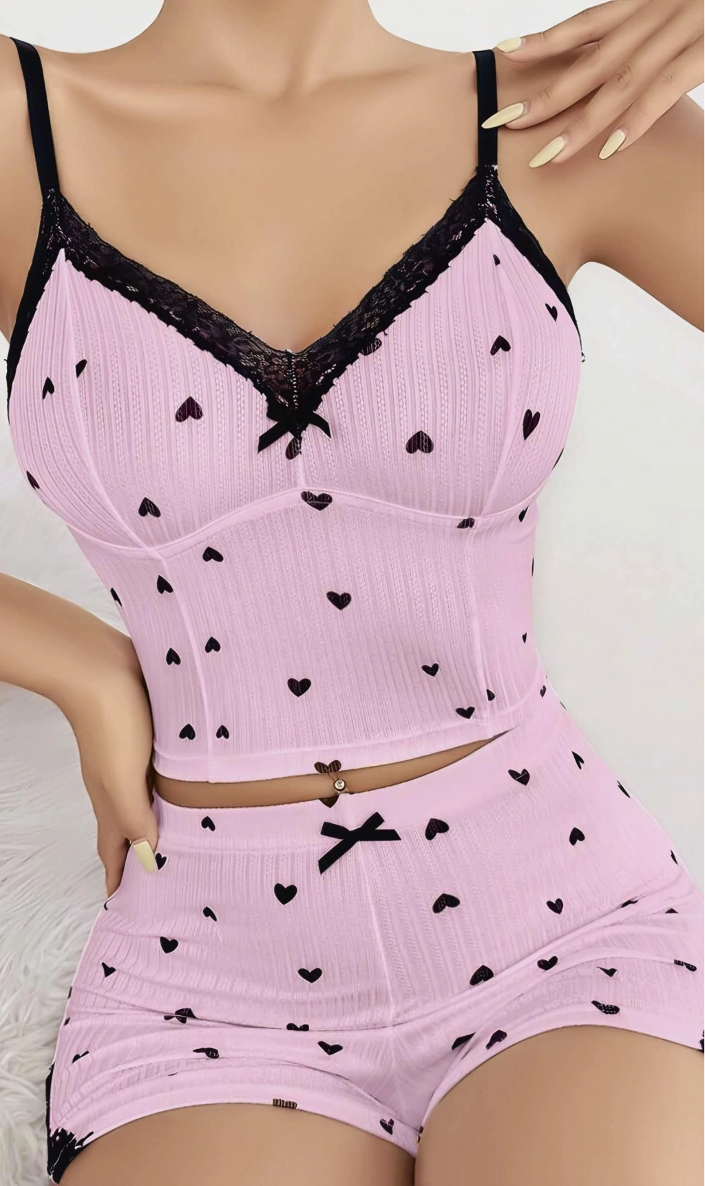 Pembe kalp desenli askılı şortlu pijama takımı, tatlı ve romantik bir stil yaratır. Hafif kumaşı ile konforlu bir kullanım sağlar.