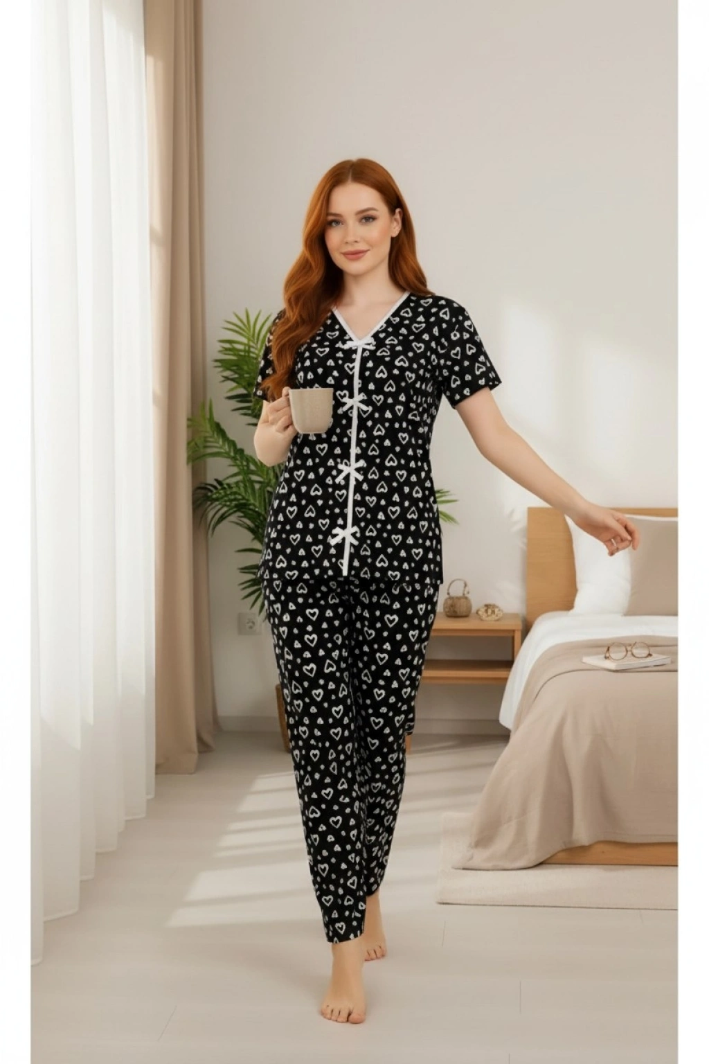 Kadın Siyah Kalp Desenli Fiyonklu Kısa Kollu Uzun Pijama Takımı, sade şıklığı ve konforu bir araya getiriyor.Yumuşak dokulu kumaşıyla cildinize nazikçe temas ederken, nefes alan yapısı sayesinde gece boyunca ferahlık sağlar.Kısa kollu üst kısmı ve uzun paçalı alt tasarımıyla dört mevsim kullanım için idealdir.Siyah zemin üzerine işlenen beyaz kalp desenleri modern bir tarz yaratırken, ön kısımdaki zarif fiyonk detayları takıma romantik bir dokunuş katar.Rahat kalıbı sayesinde uyurken veya evde vakit geçirirken maksimum hareket özgürlüğü sunar.Günlük ev giyiminde hem rahat hem de şık görünmek isteyen kadınlar için mükemmel bir tercihtir.Kaliteli dikişleri, esnek kumaş yapısı ve dikkat çekici desenleriyle uzun süreli kullanım sağlar.Kendiniz veya sevdikleriniz için özel bir hediye alternatifi olarak da uygundur.]]>