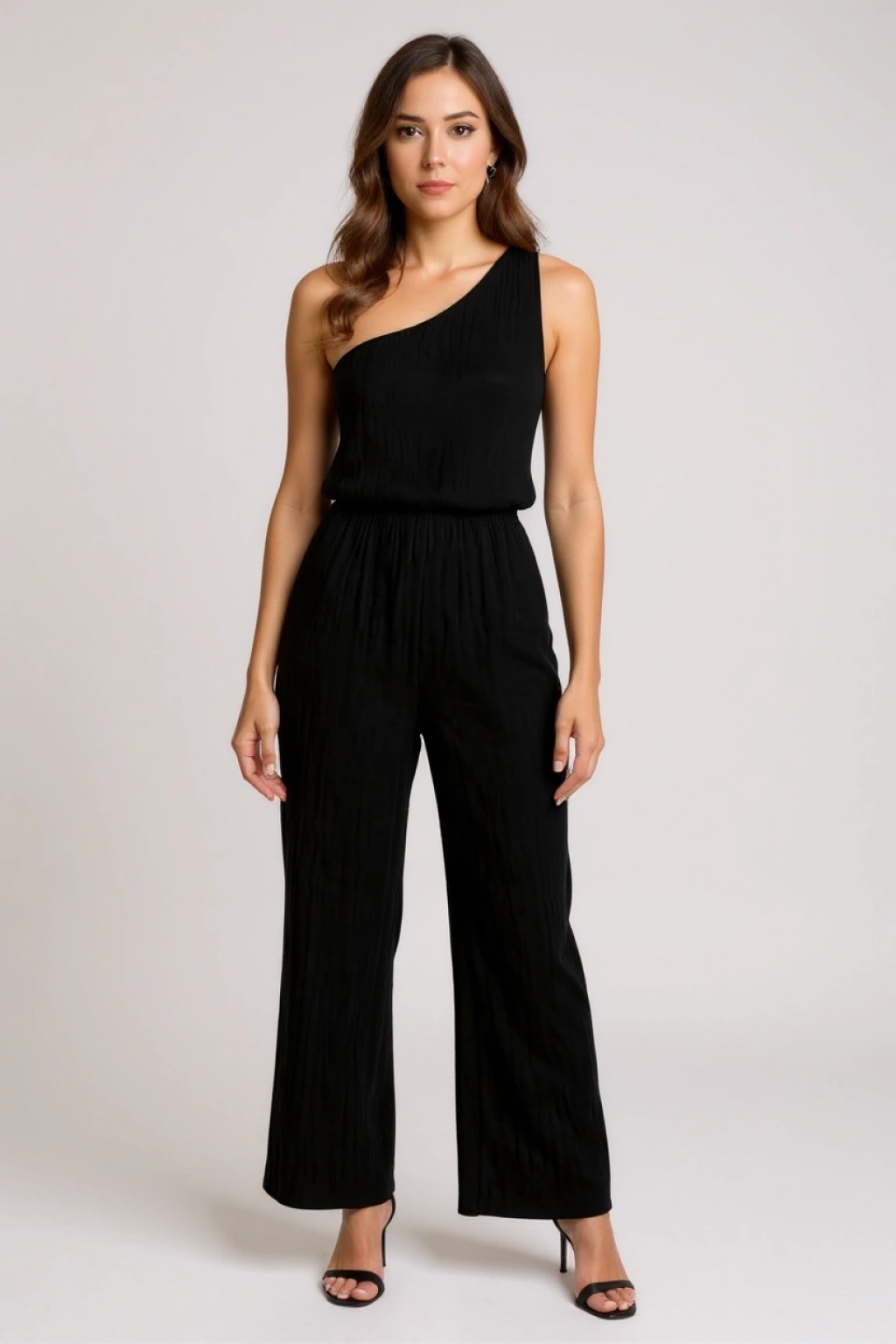 • Kadın siyah tek omuzlu bluz ve geniş paça pantolon ikili takım,  şıklığı ve rahatlığı aynı anda yaşamak isteyen kadınlar için ideal bir