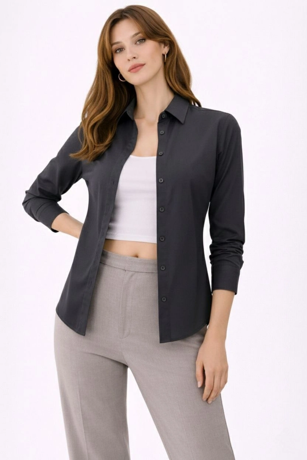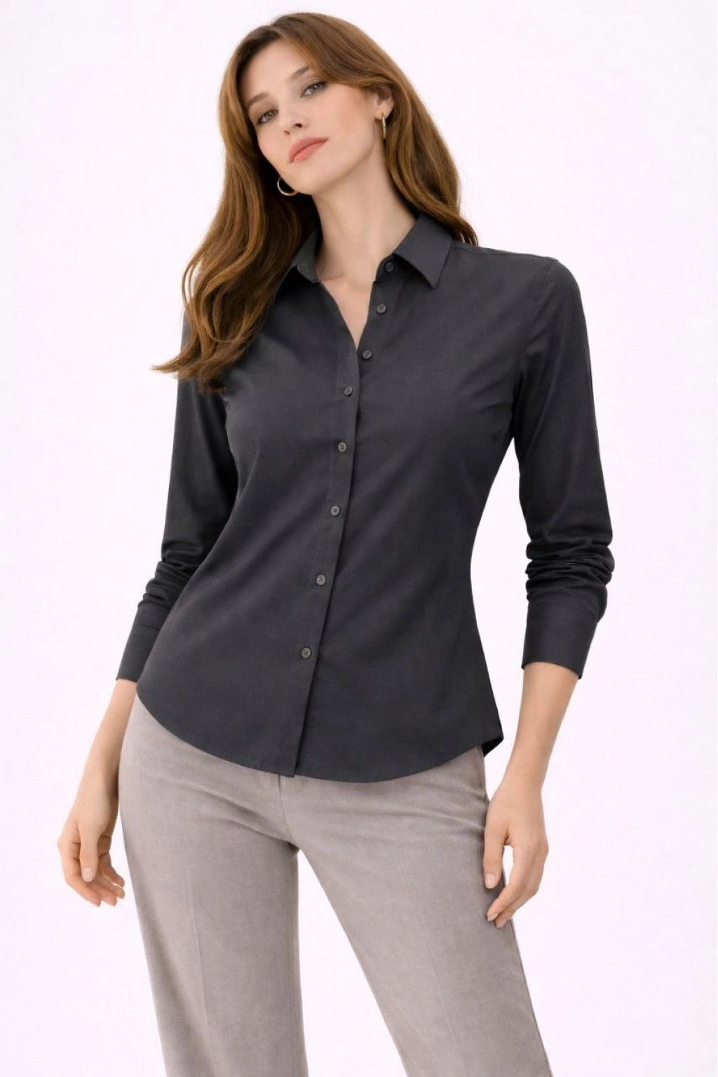 Kadın Uzun Kollu Gömlek Düğmeli Klasik Yaka Günlük ve Ofis Şıklığına uygun - Füme