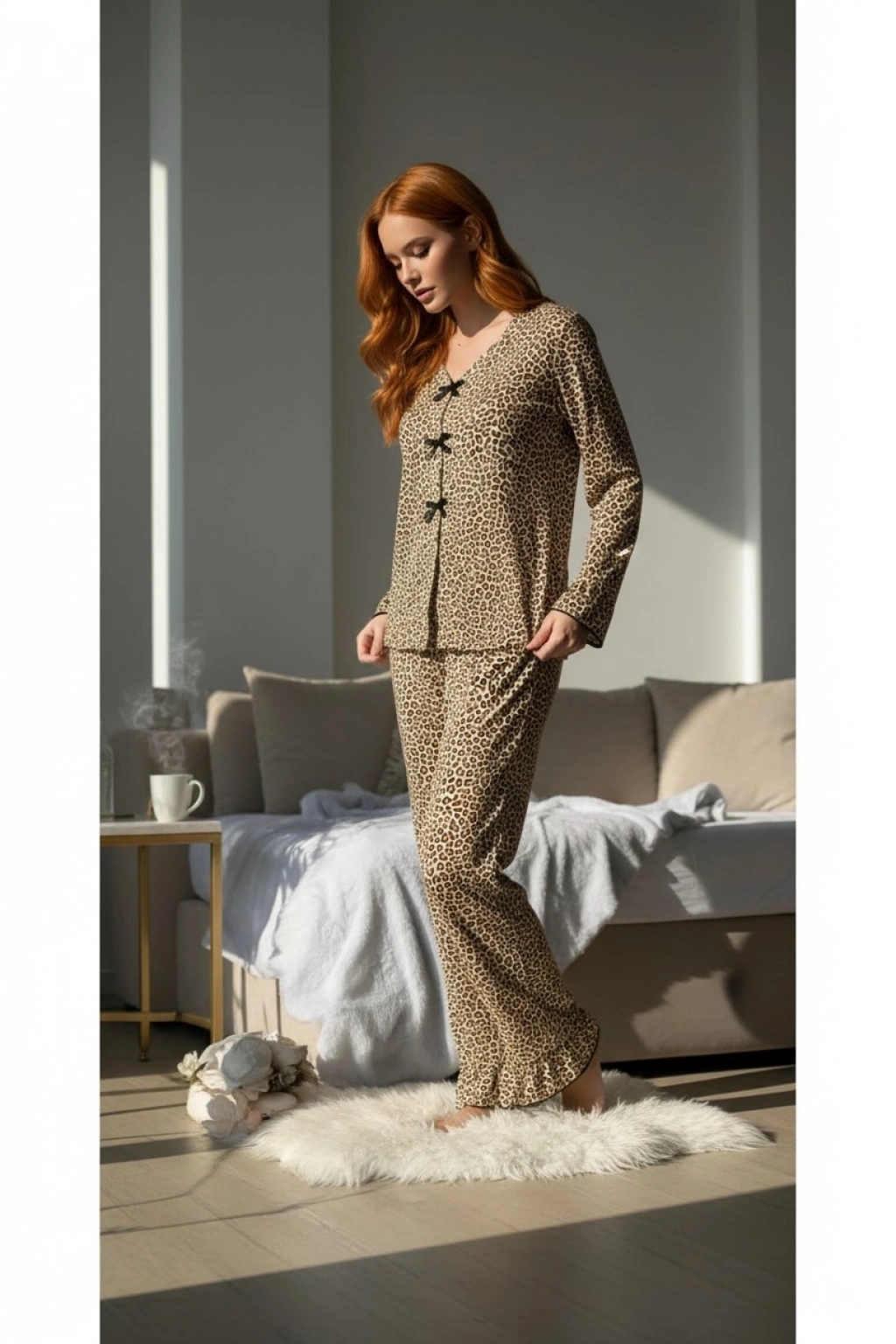 • Kadın pijama takımı, leopar desenli pijama, kadın ev giyim takımı, fiyonk detaylı pijama, rahat pijama takımı, şık ev giyim, uzun kollu pijama takımı, kadın ev kombini
