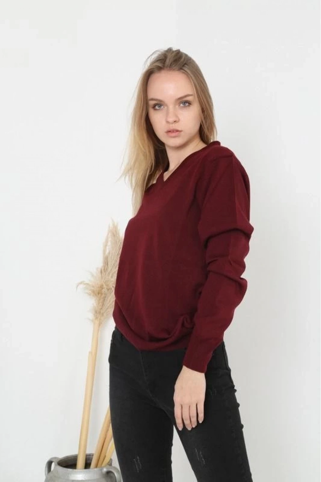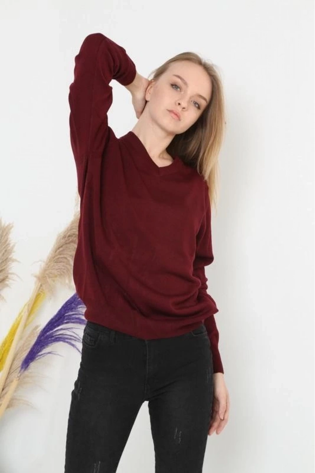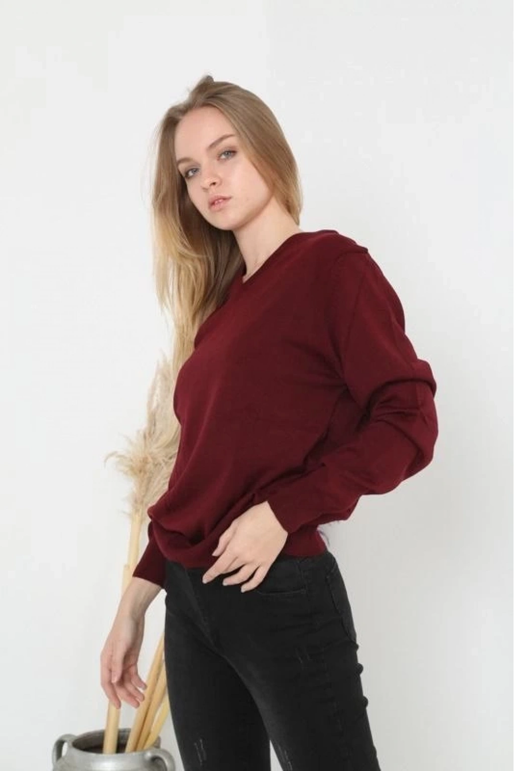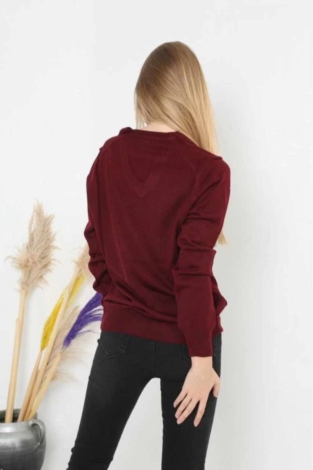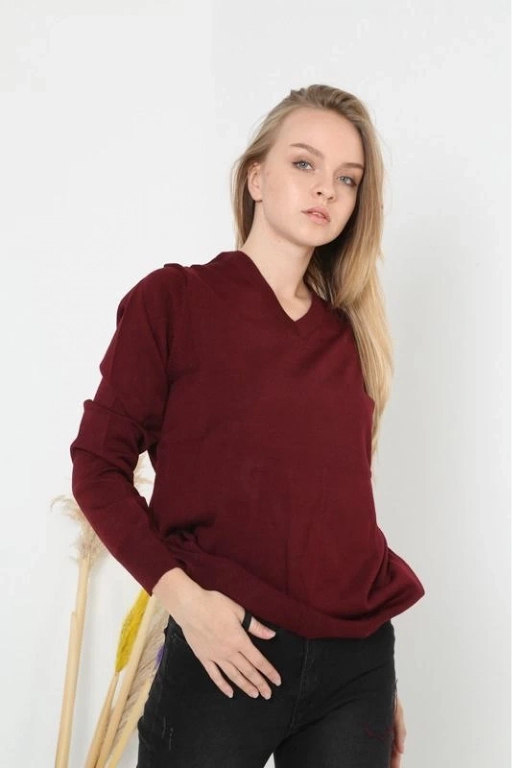 Kadın V Yaka Kazak Uzun Kol Düz Dokuma Triko - Bordo