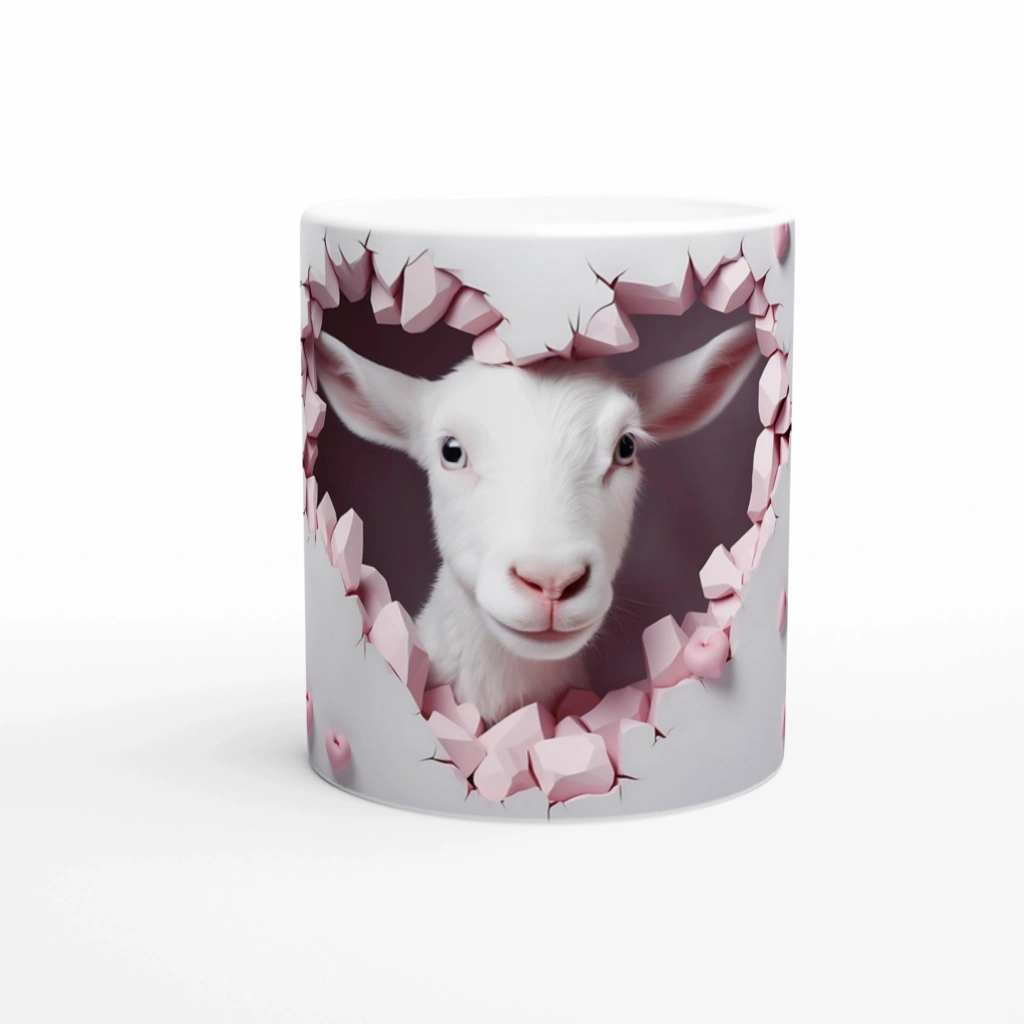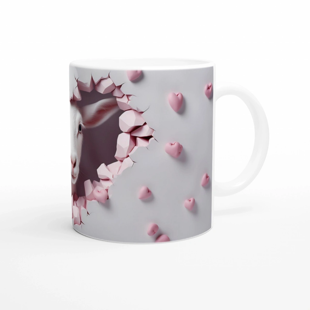 Kalp şeklinde çatlamış yüzeyin ardından bakan beyaz keçi figürü, pastel pembe tonlarındaki sevimli kalp detaylarıyla birleşerek sıcak içecek keyfinizi özel kılar.