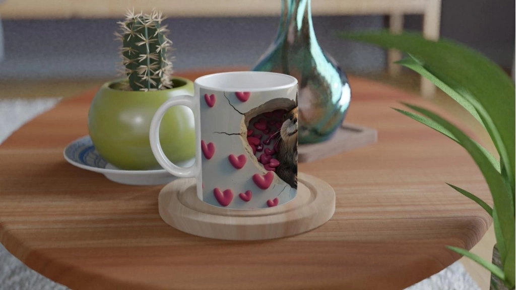 Kalp Dolu Duvardan Bakan Su Samuru Temalı Baskılı Kupa Bardak