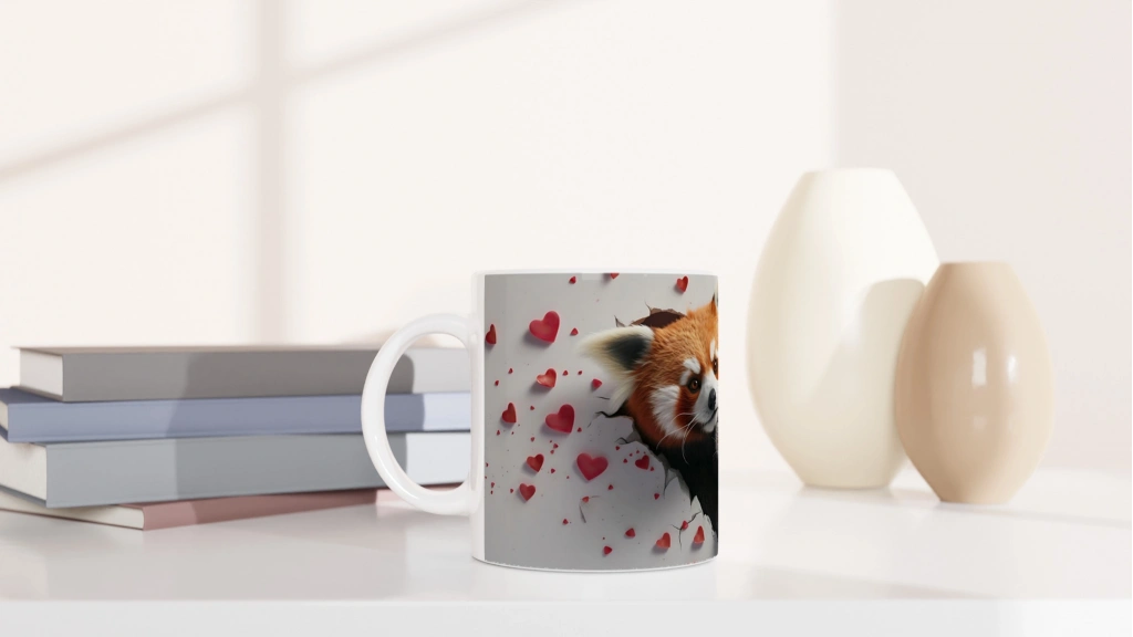 Kalp şeklinde kırılmış duvarın içinden birlikte bakan kırmızı panda çifti, bu kupayı sevgi dolu bir hediye ya da içten bir anı haline getiriyor. Romantik detayları ve canlı renkleriyle hem koleksiyonluk hem de günlük kullanım için harika bir seçenek.