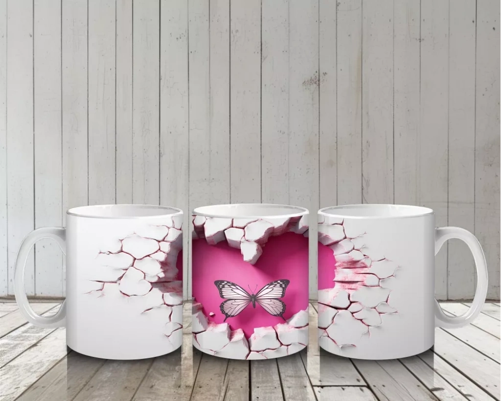 İki pembe kelebeğin kalp şeklindeki çatlakta özgürce uçuşu, sevgi ve uyumu simgeliyor. Romantik tasarımları sevenler için anlamlı ve görsel açıdan etkileyici bir kupa alternatifi.