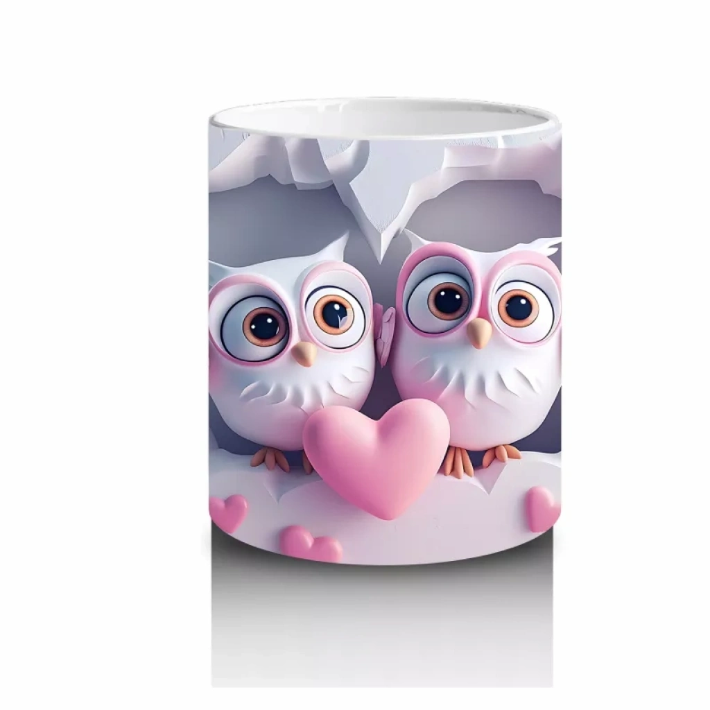 Birlikte kalp tutan iki tatlı baykuş figürü, sevgi ve bağlılığı simgeleyen sıcak bir tasarım sunuyor. Aşk temalı kupalar arasında şirinliğiyle öne çıkan bir seçenek.