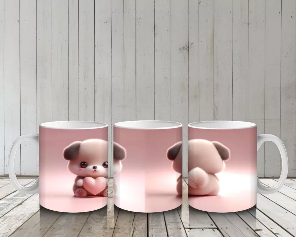 Kalp Tutan Sevimli Peluş Köpek Figürü – Baskılı Kahve Kupası
