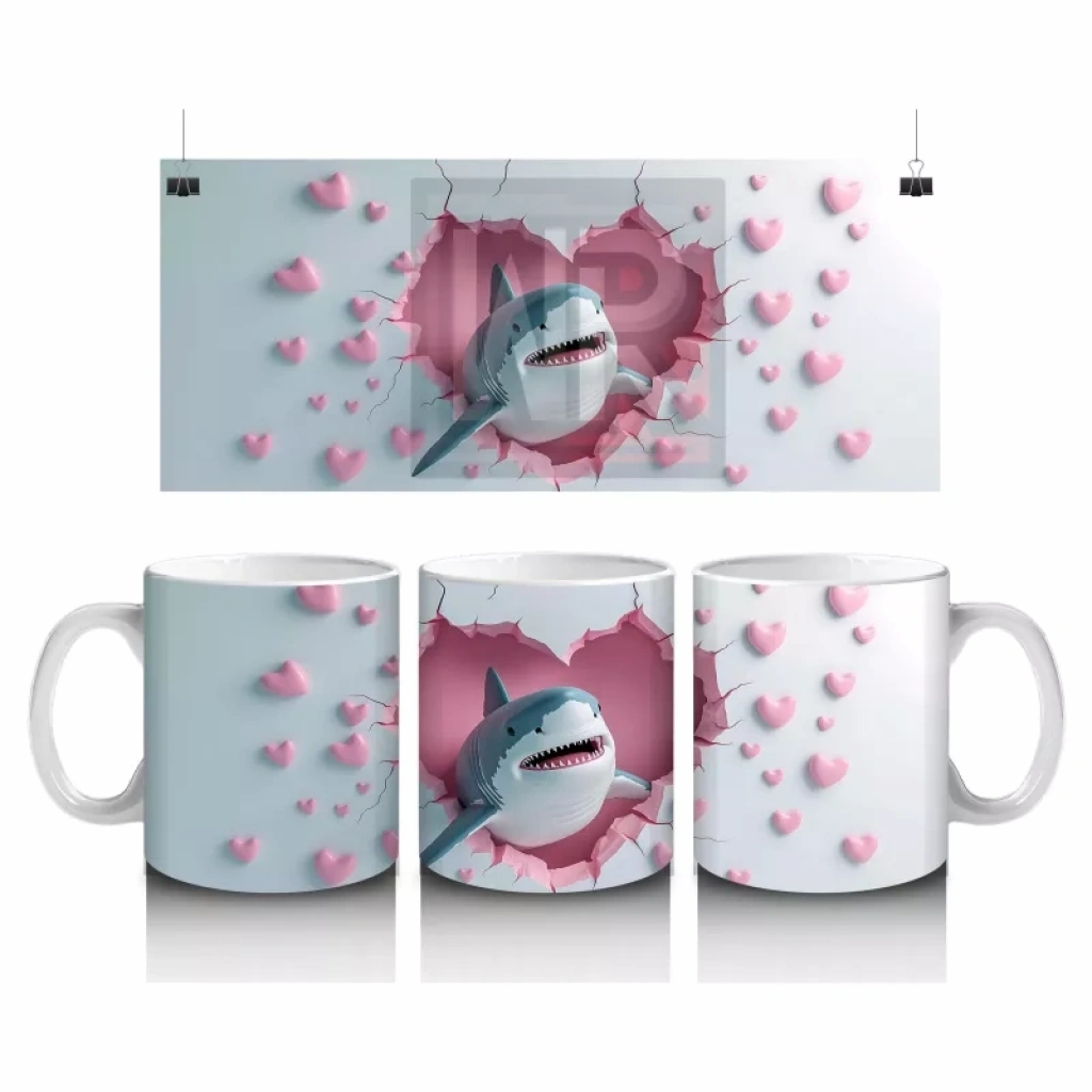 Kalp Yağmuru Altında Gülümseyen Köpek Balığı – Baskılı Kahve Kupası