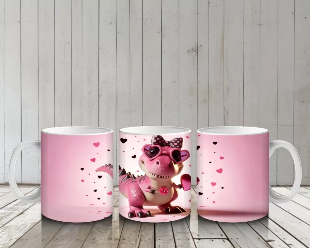 Kalplerle Süslenmiş Pembe Dinozor – Baskılı Kahve Kupası